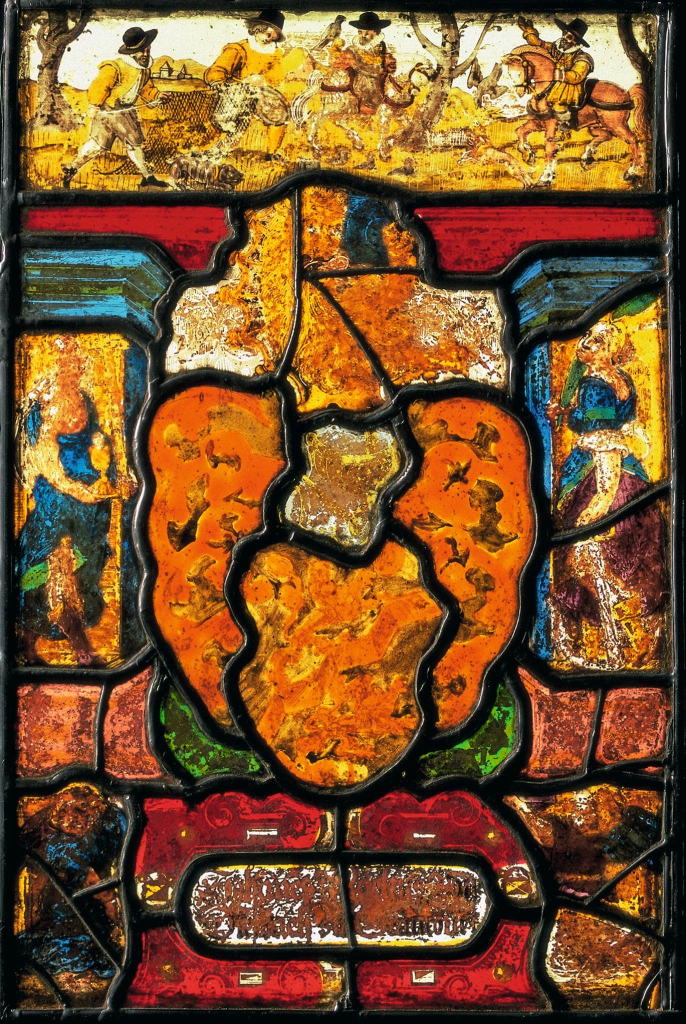 In der Mitte steht vor farblosem Damastgrund das Vollwappen des Stifters über grünem Fliesenboden. Es wird seitlich vor breiten blau-gelben Pilastern von zwei weiblichen Tugendallegorien begleitet. Links hält Fides (der Glaube) in blauem Gewand in der Rechten Kelch und Hostie, in der Linken das Kreuz; rechts stützt sich die blau-violett gekleidete Spes (die Hoffnung) mit aufschauendem Blick auf den Anker und hält in ihrer rechten Hand einen Palmzweig. Über dem roten Architrav ist eine Jagdszene dargestellt. Die Hundemeute zweier Reiter mit Falken treibt das Wild auf ein Netz zu, das von zwei entgegenkommenden Jägern ausgespannt wird. Ein Falke stürzt sich auf einzelne Enten am Boden herab. Am Fuss der Scheibe halten zwei Putten die rote Rollwerktafel mit der Stifterinschrift vor farblosem Grund.