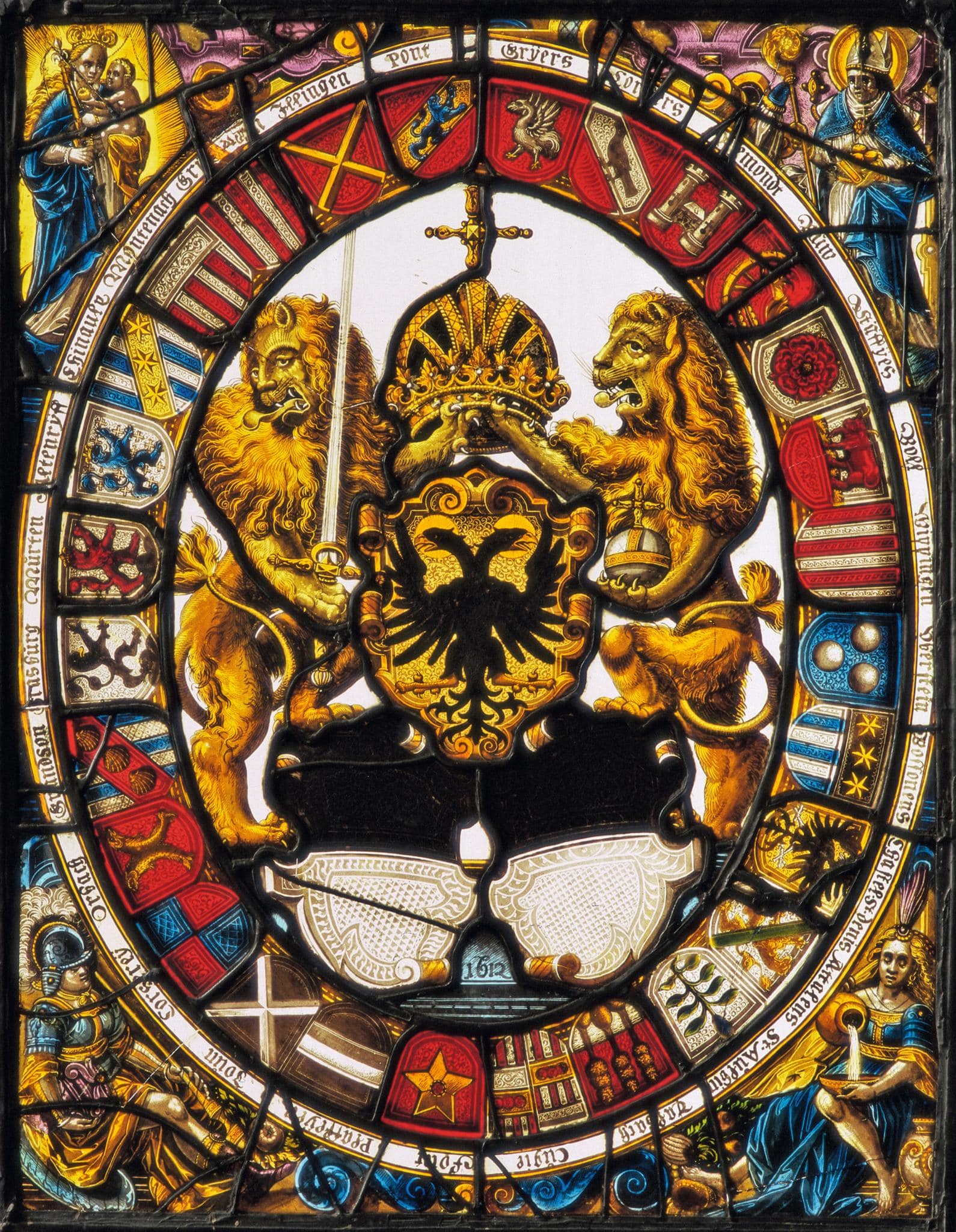Reichswappen: In Gold ein nimbierter und goldbewehrter schwarzer Doppeladler.