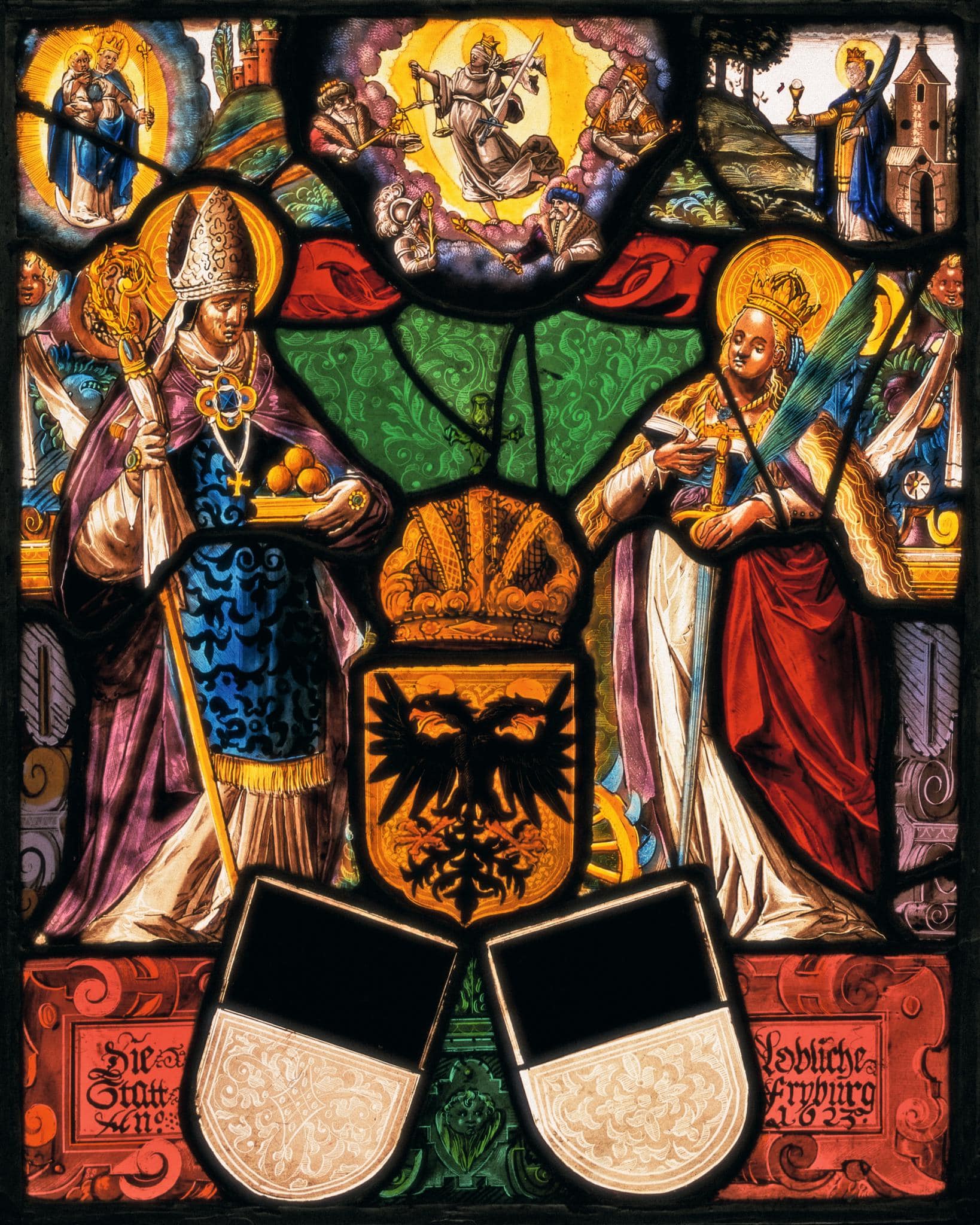Die Stadtheiligen Nikolaus und Katharina begleiten die Wappenpyramide Freiburgs vor grünem Rankengrund. Der hl. Nikolaus trägt als Bischof über der Albe eine gemusterte blaue Kasel und ein violettes Pluviale. In der Rechten hält er den Krummstab, in der Linken das Buch mit den drei Kugeln. Die als Prinzessin gekrönte Katharina ist in ein weisses Kleid und einen rot-violetten Mantel gekleidet. Das offene Buch in der Rechten, das Schwert und die Märtyrerpalme in der Linken bilden ihre weiteren Attribute. Das Rad, auf dem sie gefoltert werden sollte, befindet sich zu ihren Füssen. Beide Figuren überschneiden die aus wenigen Rollwerkformen, Früchten und Puttenköpfen bestehende Rahmenarchitektur. Vor dem roten Architrav prangt eine umwölkte Gloriole. Vier durch Zepter gekennzeichnete Herrscher in unterschiedlicher Tracht umgeben die im Licht erscheinende Allegorie der Gerechtigkeit mit Schwert und Waage. In den Zwickeln stehen die Muttergottes im Strahlenkranz und die hl. Barbara vor offener Landschaft als Patrone der Stadt Freiburg. Am Fuss der Scheibe befinden sich die geneigten Wappenschilde der Stadt vor der in der Mitte unterbrochenen roten Inschrifttafel.