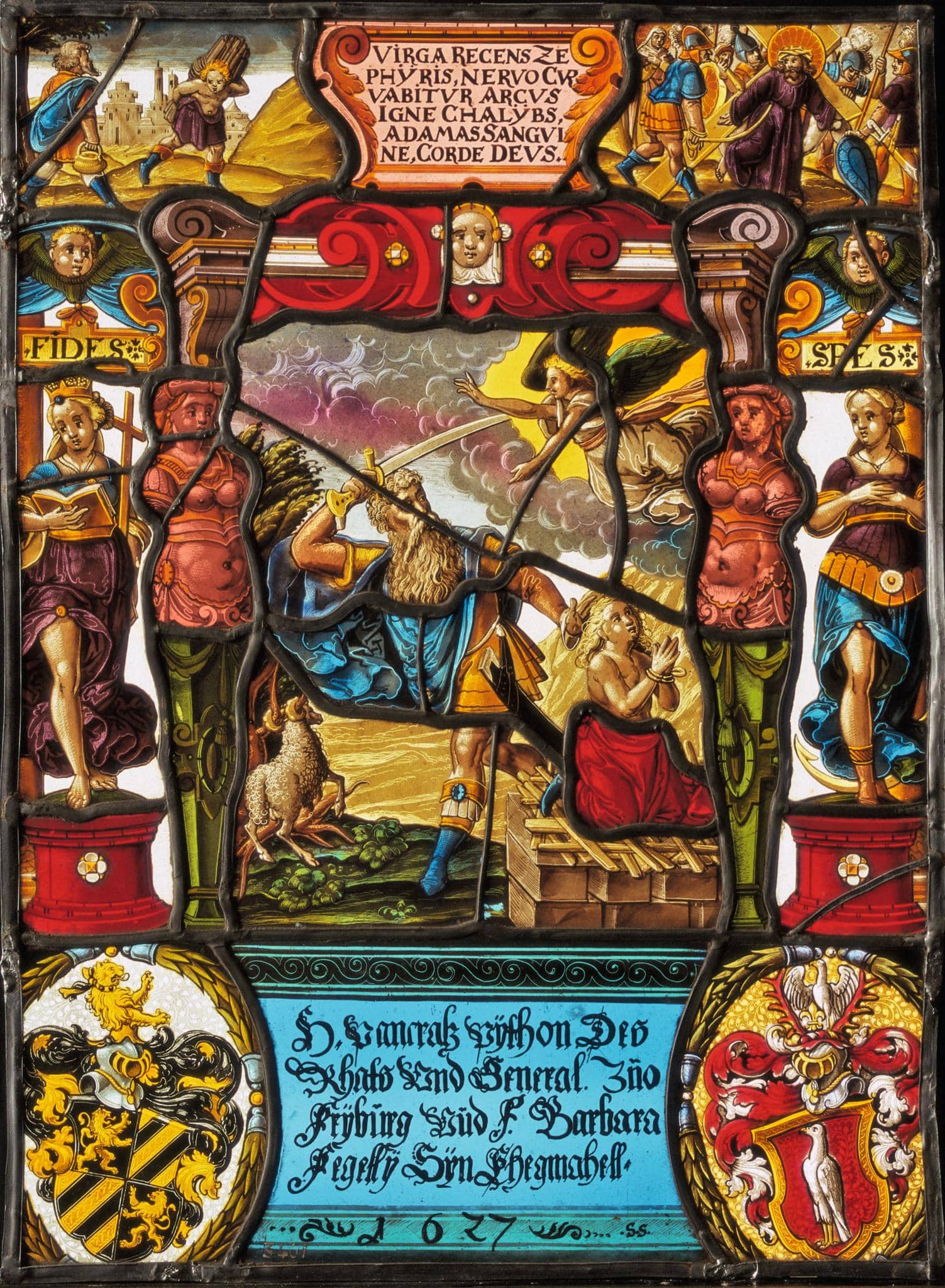 Zwischen zwei grün-rotbraun geteilten Karyatiden, die das volutenverzierte Gebälk mit Kopfkartusche tragen, stellt das Mittelbild Abrahams Opfer dar (Gn 22, 1–19). Isaak kniet mit gefesselten, betend erhobenen Händen nach rechts blickend auf dem mit Holzscheiten belegten Altarblock. Sein rotes Gewand ist vom Oberkörper gestreift. Hinter ihm steht sein Vater, in einen gelben kurzen Rock und einen blauen Mantel gekleidet, die leere Scheide seines Säbels um die Hüften gebunden. Mit energischem Schritt schickt er sich an, seinen Sohn mit der erhobenen Waffe zu opfern. Dabei erblickt er jedoch den Engel, der ihm Einhalt gebietet und auf das Ersatzopfer, den in einem Busch verfangenen Widder, aufmerksam macht. Zu Seiten des Hauptbildes stehen über trommelartigen Sockeln zwei weibliche Tugenden, die über ihren Häuptern in unter Puttenköpfen hängenden Tafeln bezeichnet sind: Links Fides (der Glaube), eine gekrönte junge Frau in violettem Rock und blauem Mieder, das offene Buch in der Rechten, in der Linken das Kreuz haltend; rechts Spes (die Hoffnung), in blauem Kleid und violettem panzerartigem Mieder mit dem Anker zu ihren Füssen. In der Mitte des Oberbildes befindet sich die von typologisch gegenübergestellten Bildszenen aus dem Alten und Neuen Testament beseitete lateinische Bildinschrift. Links trägt Isaak, von Abraham gefolgt, das Holz für seine eigene Opferung zur Altarstelle, rechts trägt Christus unter Begleitung der Häscher und von seiner Mutter beobachtet, das Kreuz nach Golgatha. Am Fuss nimmt ein blauer Sockel die Stifterinschrift auf, beseitet von den (ergänzten) Vollwappen der Stifter in ovalen Lorbeerkränzen.