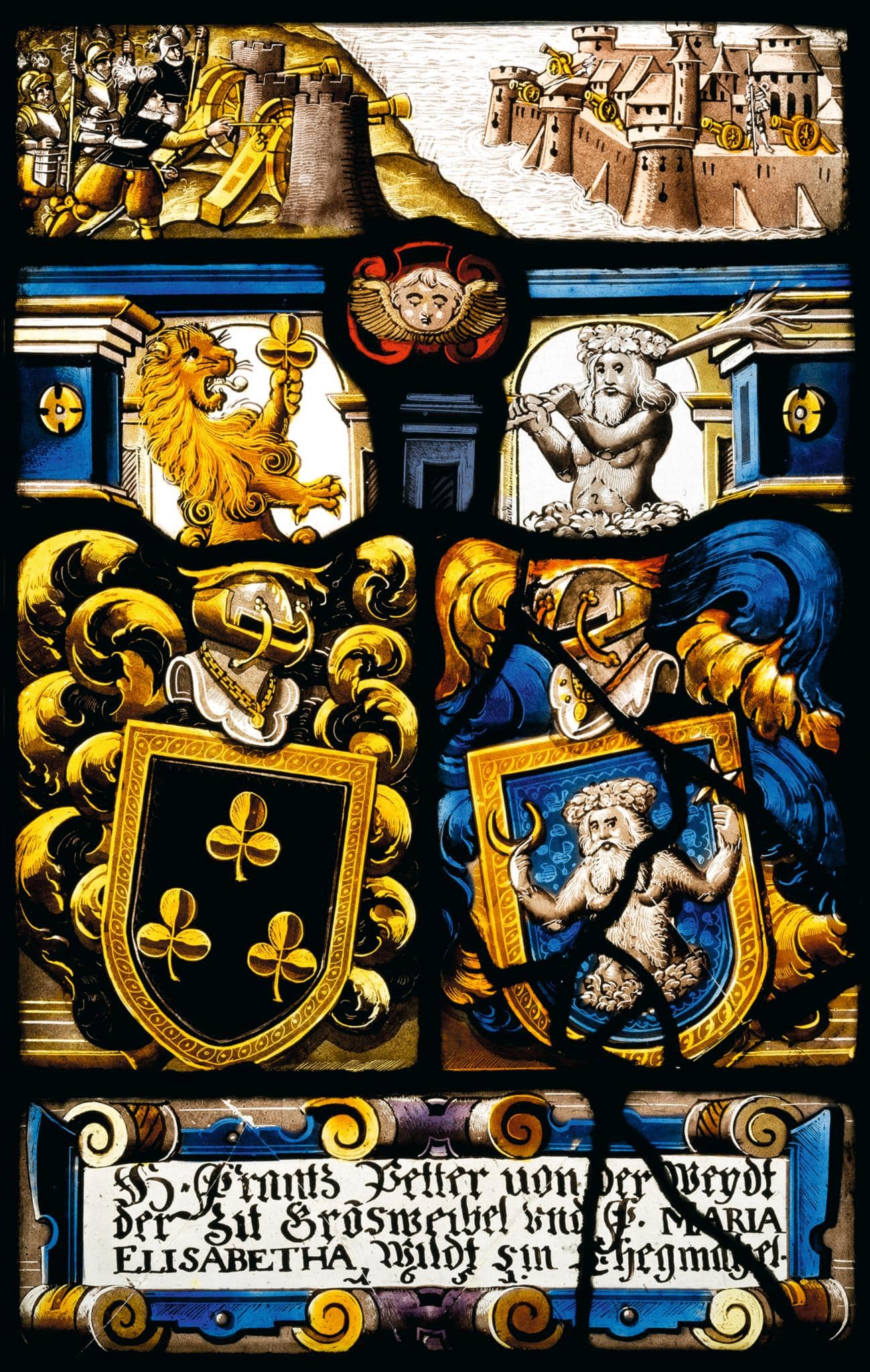 Vor einer zweiteiligen blauen Pilasterarchitektur neigen sich die beiden Stifterwappen in heraldischer Höflichkeit einander zu. Das Oberbild nimmt über dem schmalen Architrav mit engelskopfgeschmückter Mittelkartusche eine Belagerungsszene auf. Eine befestigte, von einem Wassergraben umschlossene Stadt wird von zwei Kanonen unter Beschuss genommen. Dahinter warten die Belagerer auf ihren Einsatz. Am Fuss der Scheibe enthält eine Rollwerkkartusche die Stifterinschrift.