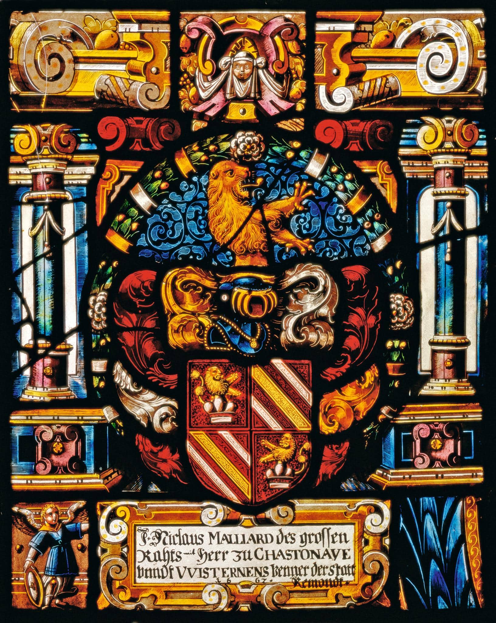 Stifterinschrift: J. Niclaus Malliard des grossen / Rahts Herr zu Chastonaye / vnndt Vvisternens venner der statt / Remondt / 1662.