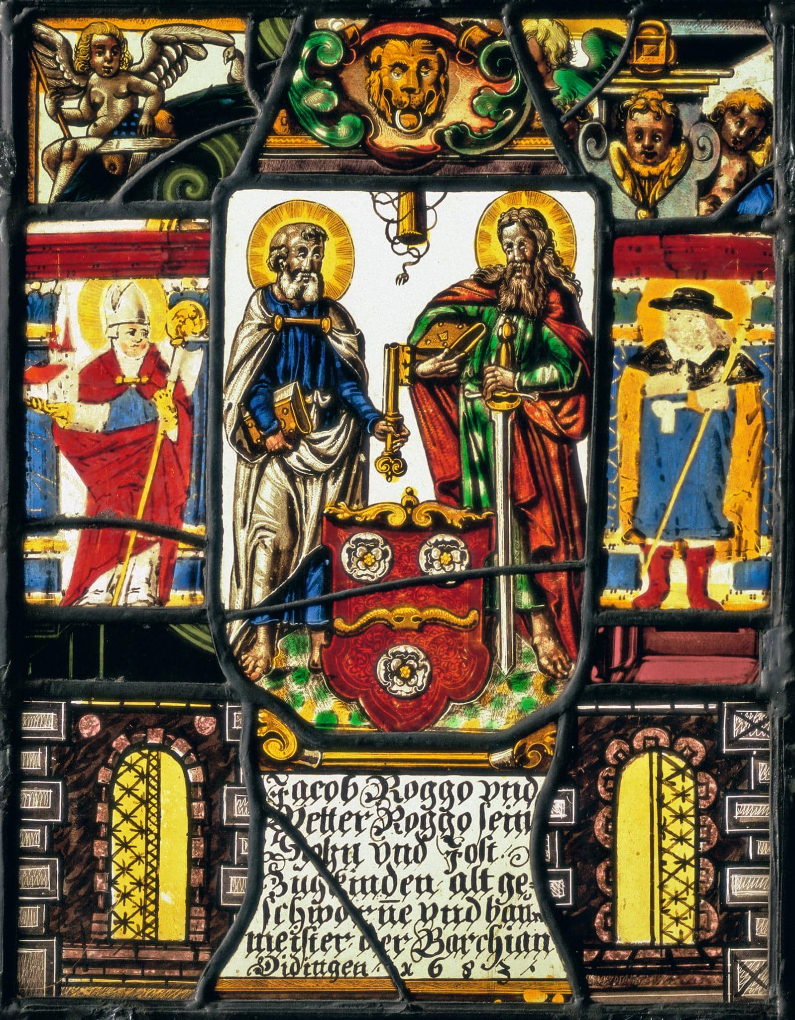 Bergmann, U. (2016). Figurenscheibe Jakob und Peter Roggo, Jost Zurkinden 1683: Hll. Petrus und Paulus. Dans Vitrosearch. Consulté le 5 décembre 2025 de https://www.vitrosearch.ch/objects/2564173.