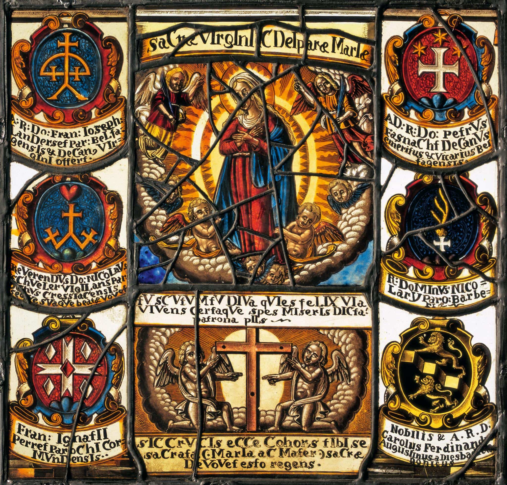 Das Hauptbild der Scheibe ist der Muttergottes im Strahlenkranz gewidmet, die von Engeln in einem Wolkenkranz in den Himmel getragen wird. Ein Inschriftband nennt die lateinische Huldigungsformel der Jungfrau. Maria trägt ein rotes Kleid und einen blauen Mantel sowie ein weisses Kopftuch. Die Hände vor der Brust gekreuzt, senkt sie demutsvoll das Haupt. Im Fussteil begleiten zwei Engel zwischen zwei Bildinschriften in einem Wolkenkranz das umstrahlte Heilige Kreuz. Zu beiden Seiten sind übereinander je drei Wappen der Pfarrherren des Dekanats mit den entsprechenden Inschriftbändern angeordnet. Mit grösster Wahrscheinlichkeit besass die Scheibe ursprünglich das gleiche Hochformat wie die beiden anderen Scheiben (FR_202 und FR_204) und führte auch die drei Pfarrherren-Wappen von Grolley, Givisiez und Villarepos, die heute in die Kapitelscheibe St. Nikolaus eingeflickt sind.