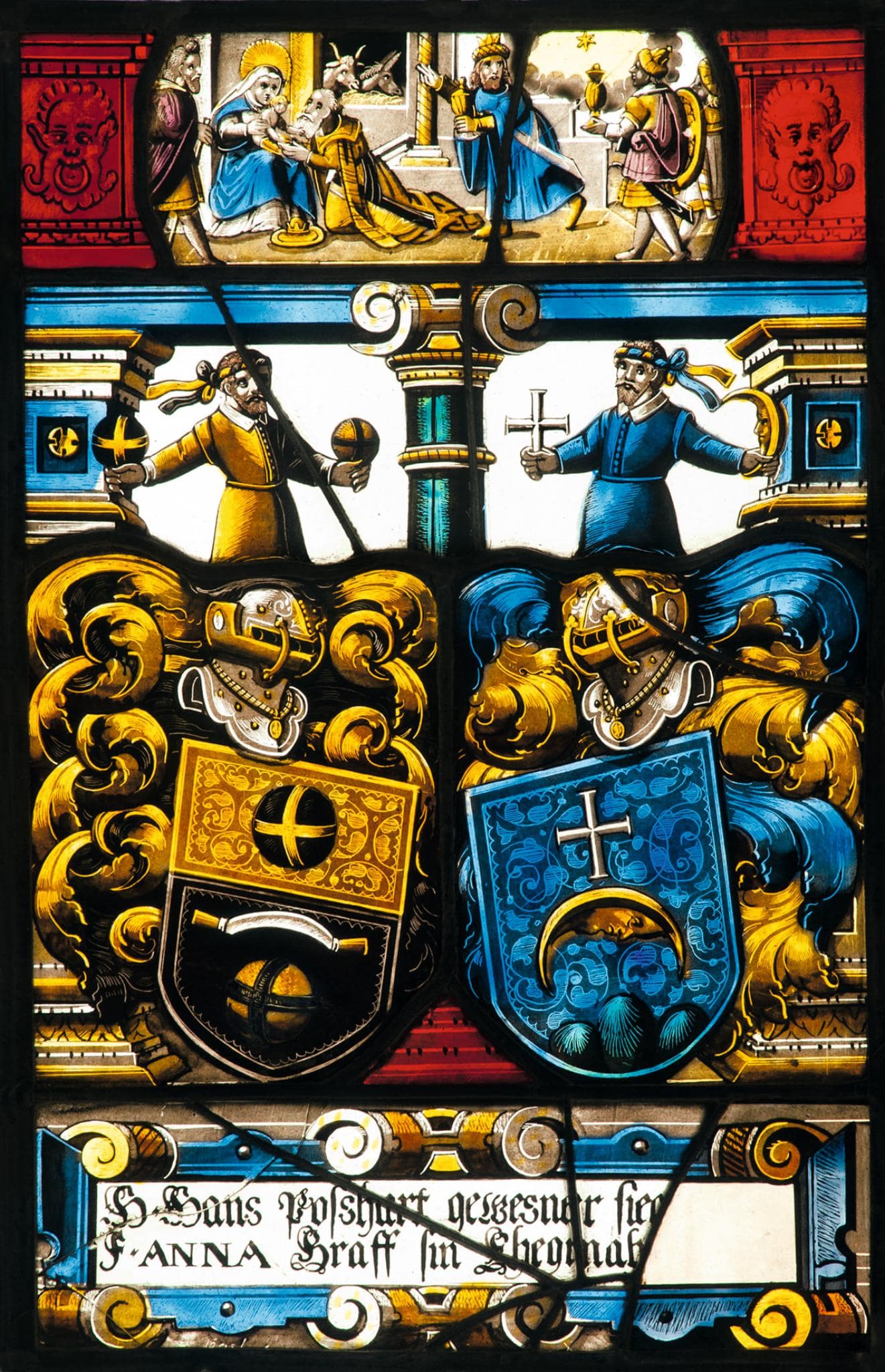 Vor der zweiachsigen Architektur und vor farblosem Grund stehen die beiden einander leicht zugeneigten Wappen der Stifter. Die rahmenden, nahezu verdeckten Pilaster und die blaugrüne Mittelsäule tragen ein schmales blaues Gebälk, über dem zwischen maskenverzierten roten Podesten die Anbetung der Könige dargestellt ist. Vor dem Sockel am Fuss der Scheibe steht die blau-gelb gerahmte Rollwerkkartusche mit der Stifterinschrift.