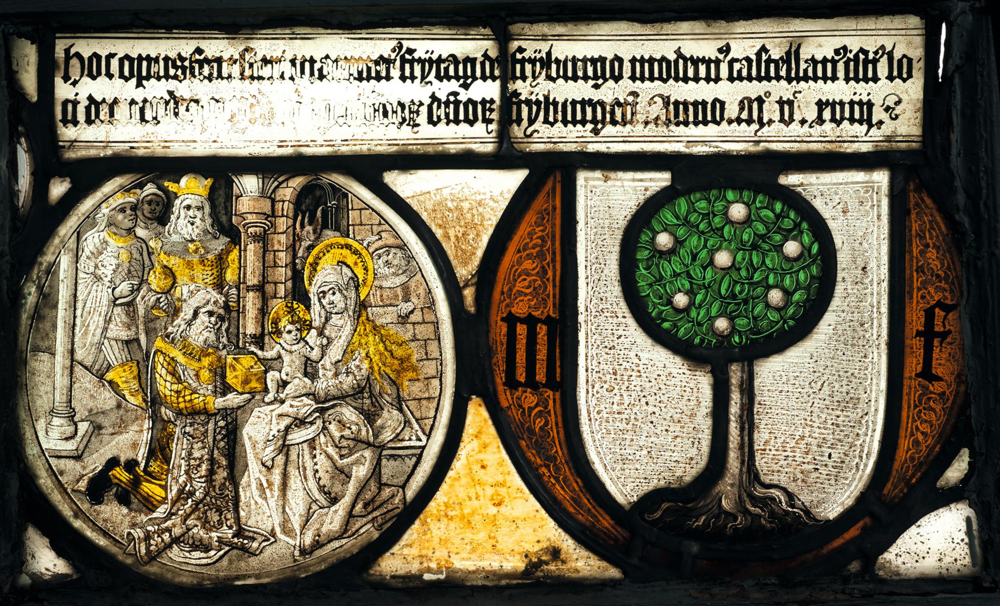 Zwei nebeneinanderstehende Rundscheibchen sind oben durch ein Inschriftband zusammengefasst. Die Rundel links zeigt die Darstellung der Epiphanie innerhalb eines Gemäuers, dessen Säulen die Ansätze eines Gewölbes tragen. Im Vordergrund kniet der erste König vor dem Christkind, das auf dem Schoss Mariens sitzt. Der König trägt über den gestreiften Beinlingen ein Hemd mit Rautenmuster und ein prächtiges brokatverziertes Obergewand mit reichen Borten. In seinen Händen präsentiert er eine Schatulle mit Goldmünzen. Im Hintergrund erscheinen die beiden anderen Könige mit einem Begleiter, links der dunkelhäutige mit hohen Stiefeln und Turban, rechts ein gekrönter Bärtiger in gelbem Wams. Im Rücken der Jungfrau betrachtet der hl. Josef hinter einer Mauerbrüstung die Anbetungsszene. Im offenen Torbogen werden Ochs und Esel sichtbar. Die Rundel rechts zeigt den Wappenschild Frytag, begleitet von den Minuskeln m und f auf braungelbem Grund.