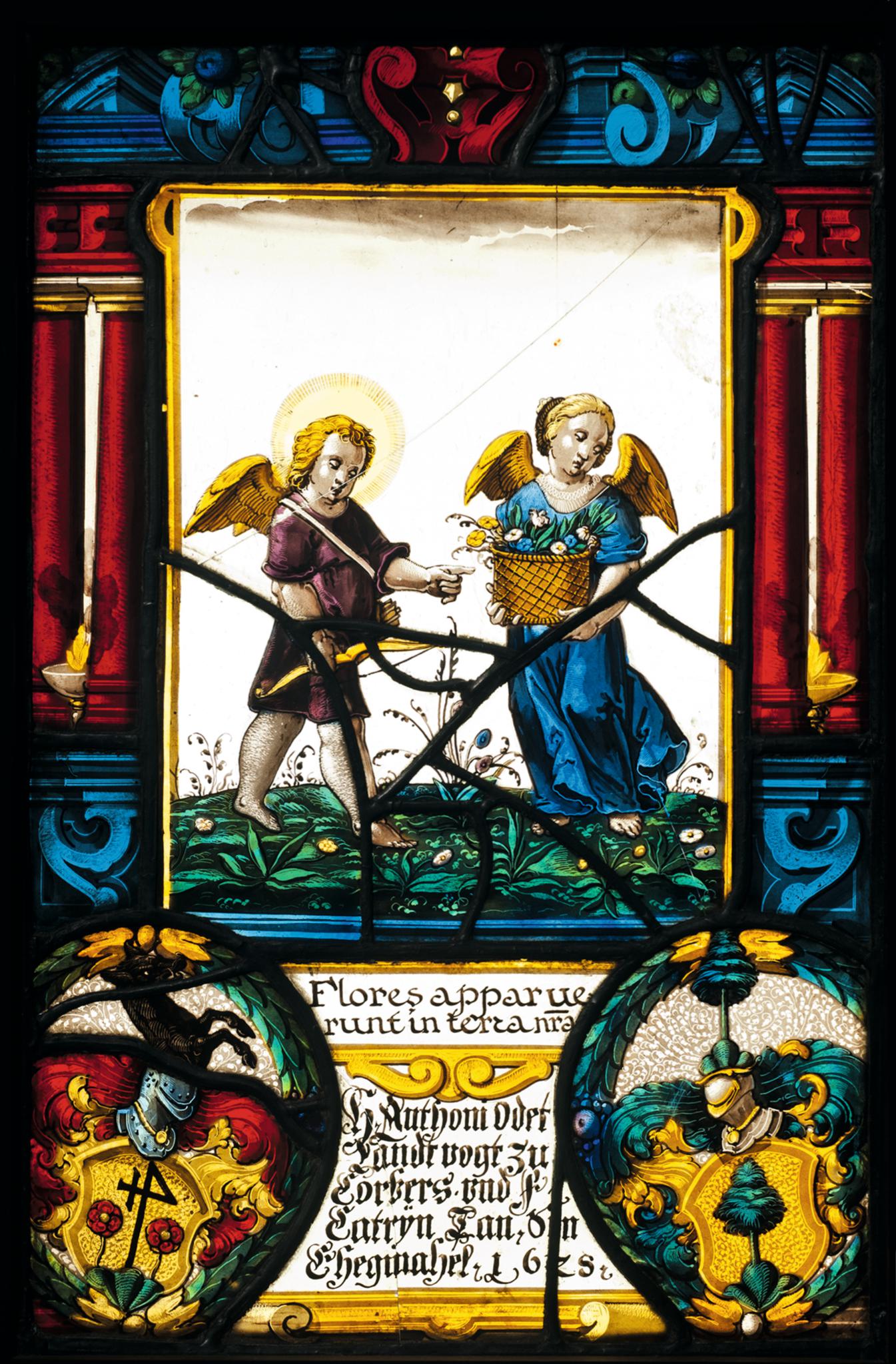 Die blühenden Blumen, die der Erde entspriessen, sind hier sicher Ausdruck der Liebe und Freude. Als Schmuck der Jugend und Braut sind sie auch Zeichen des überwundenen Winters und beginnenden Frühlings. Darauf weist auch die Bildinschrift hin, die dem Hohelied Salomos 2,12 entnommen ist: “Blumen sind in unserer Erde erschienen”. Der Putto mit Heiligenschein ist wie der mythologische Amor mit Pfeil und Bogen gerüstet. Sicher spielen im christlichen Sinn auch Paradieseshoffnungen mit. Als Vorlage diente dem Glasmaler nämlich ein Stich Johann Sadelers (1550–1600) mit der sitzenden Muttergottes im Paradiesgarten (The Illustrated Bartsch 70 [Part 4]. 2003. S. 192; Bergmann 2014. Bd. 2. Abb. 246.2). Der Glasmaler übernahm jedoch allein die sie begleitenden Figuren, indem er das früchtekorbtragende Mädchen der Vorlage mit Flügeln versah und dem linken Putto statt des Apfels einen Pfeilbogen in die Hand gab.