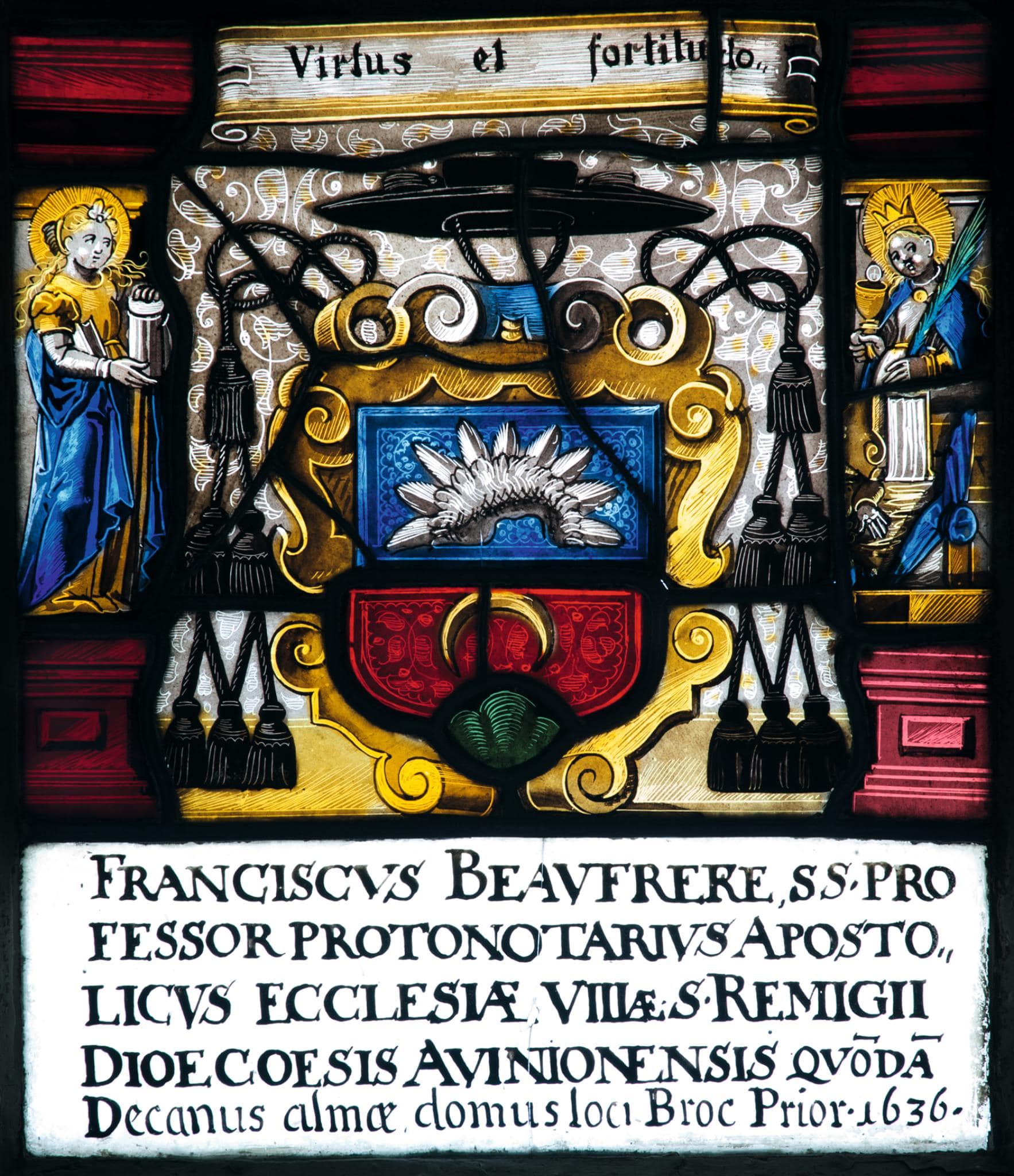 Stifterinschrift: FRANCISCVS BEAVFRERE, SS. PRO / FESSOR PROTONOTARIVS APOSTO,, / LICVS ECCLESIÆ VILLÆ. S. REMIGII / DIOECOESIS AVINIONENSIS QUŌDĀ / Decanus almæ Domus loci Broc Prior. 1636.