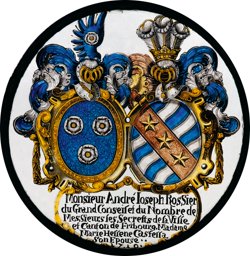Die Rundscheibe ist gleich aufgebaut wie die Stiftung des François-Joseph de Castella. Zwei wegsehende Löwen halten vor Waffentrophäen die von der Freiherrenkrone mit neun Kugeln überhöhte goldene Rollwerkkartusche mit dem ovalen Wappenschild des Stifters. Am Fuss steht vor dem Bretterboden die Stifterinschrift.