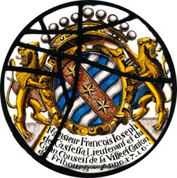 Sein Wappen findet sich auch auf einer zusammengeflickten Scheibe (FR_398).
