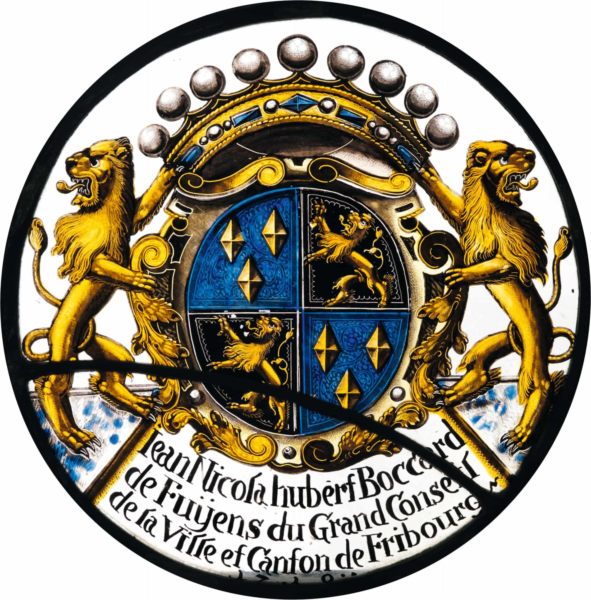 Jean Nicolas Hubert de Boccard wurde als Sohn des Jean Pierre de Boccard (FR_264) in Grandson geboren und am 23.9.1683 in Cheyres getauft. Seit 1707 sass er im Grossen Rat. Der Herr von Fuyens amtete 1730–1731 auch als Vogt von Grandson. Er war mit Maria Anna d'Amman von St-Barthélemy (1696–1764) verheiratet. Ihrer Ehe entsprang ein einziger Sohn. Jean Nicolas Hubert starb am 7.12.1731 und wurde in Cheyres beigesetzt (Nach Weitzel 1732 verstorben. Sein Grabstein beschrieben bei Lüthi 2013. Bd. II. S. 204–205). Er war ein Schwager Jean Antoine de Castellas, in dessen Kapelle er die vorliegende Scheibe stiftete.