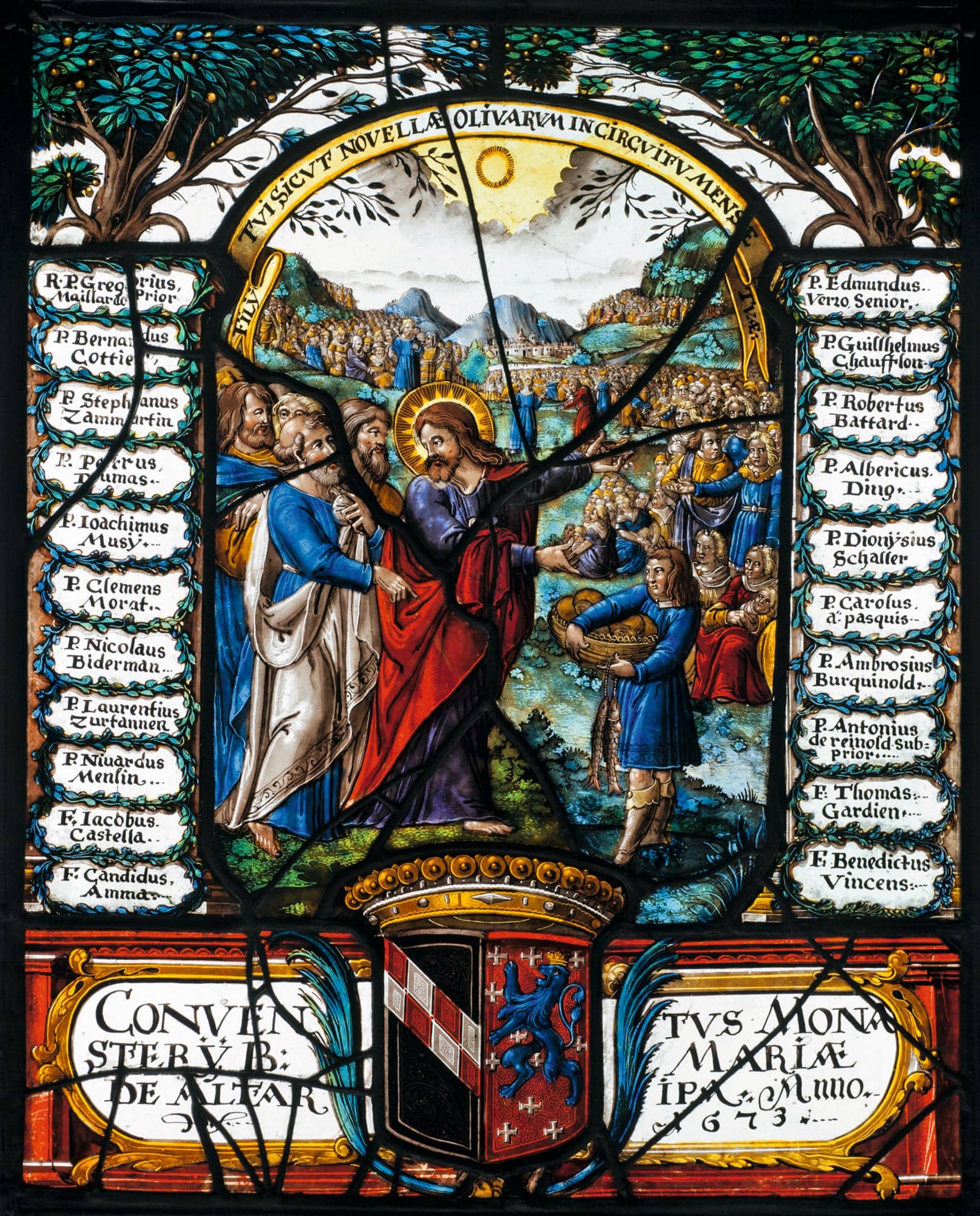 Das Mittelbild stellt unter einem Segmentbogen, der die Bildinschrift trägt, die wundersame Brotvermehrung dar. Die Evangelien berichten von einer ersten und einer zweiten Brotvermehrung: Christus speist zuerst fünftausend Menschen mit fünf Broten und zwei Fischen (Mt 14, 13–21; Mk 6, 30–44; Lk 9, 10–17; Jo 6, 1–15), dann viertausend Anhänger mit sieben Broten und einigen Fischen (Mt 15, 32–39; Mk 8, 1–9). Christus steht im Zentrum des Bildes und wendet sich zu Petrus und den anderen Aposteln, die ihn auf die hungrigen Menschen im Hintergrund aufmerksam machen. Die grosse Schar, die dem Messias gefolgt war, breitet sich bis zum See und über die Hügel hinweg aus. Mit der Linken segnet Christus die beiden Fische und das Brot, das ihm ein Diener im Korb entgegenhält. Im Hintergrund ist möglicherweise eine Heilungsszene dargestellt, vielleicht die der zweiten Brotvermehrung vorausgehende Heilung der Tochter der Kanaanäerin (Mt 15, 21–28, Mk 7, 24–30). Das Hauptbild wird von aufeinandergesetzten, mit Olivenzweigen gerahmten Inschriftkartuschen mit den Namen der Konventsmitglieder gerahmt. Die Namenstafeln enden in den Kronen zweier Olivenbäume, welche die Zwickel ausfüllen und mit einzelnen Zweigen gar ins Mittelbild herunterragen. Am Fuss der Scheibe steht das gekrönte, palmzweiggerahmte und geteilte Wappen Cîteaux–Hauterive vor der Kartusche mit der Stifterinschrift. Das Inschriftband, das den Bogen bildet, nimmt Bezug auf den Psalm 127: “ Deine Söhne sitzen wie die jungen Olivenzweige rund um deinen Tisch (wie es dem Mann ergehen soll, der gottesfürchtig ist)”.