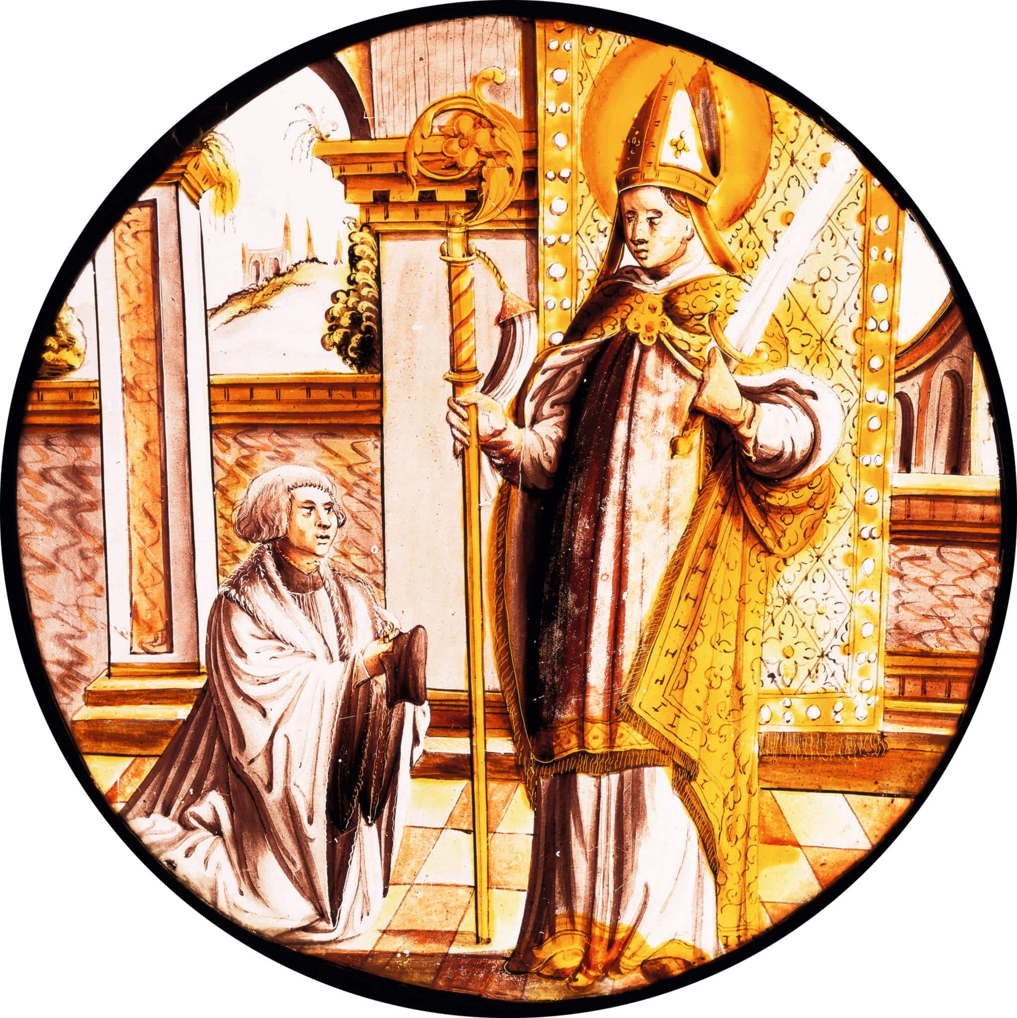 Der geistliche Stifter kniet zu Füssen eines hl. Bischofs. Er trägt über dem Chorkleid eine pelzverbrämte Schaube und hält in den gefalteten Händen das Birett. Sein Namenspatron wird durch den hinter ihm aufgehängten Wandbehang besonders hervorgehoben. Über der Albe trägt der Bischof eine rote Dalmatika und ein gelbes Pluviale. Er hält in der Linken das mit dem Panisellum versehene Pedum als Zeichen seiner geistlichen Würden und in der Rechten ein blankes Schwert. Es dürfte sich damit um den hl. Bischof Theodul von Sitten handeln, der von Karl dem Grossen die weltliche Herrschaft und richterliche Gewalt über das obere und untere Wallis erhalten hatte. Das Figurenpaar befindet sich in einer offenen Halle, über deren Brüstung der Blick auf eine offene Hügellandschaft geht.