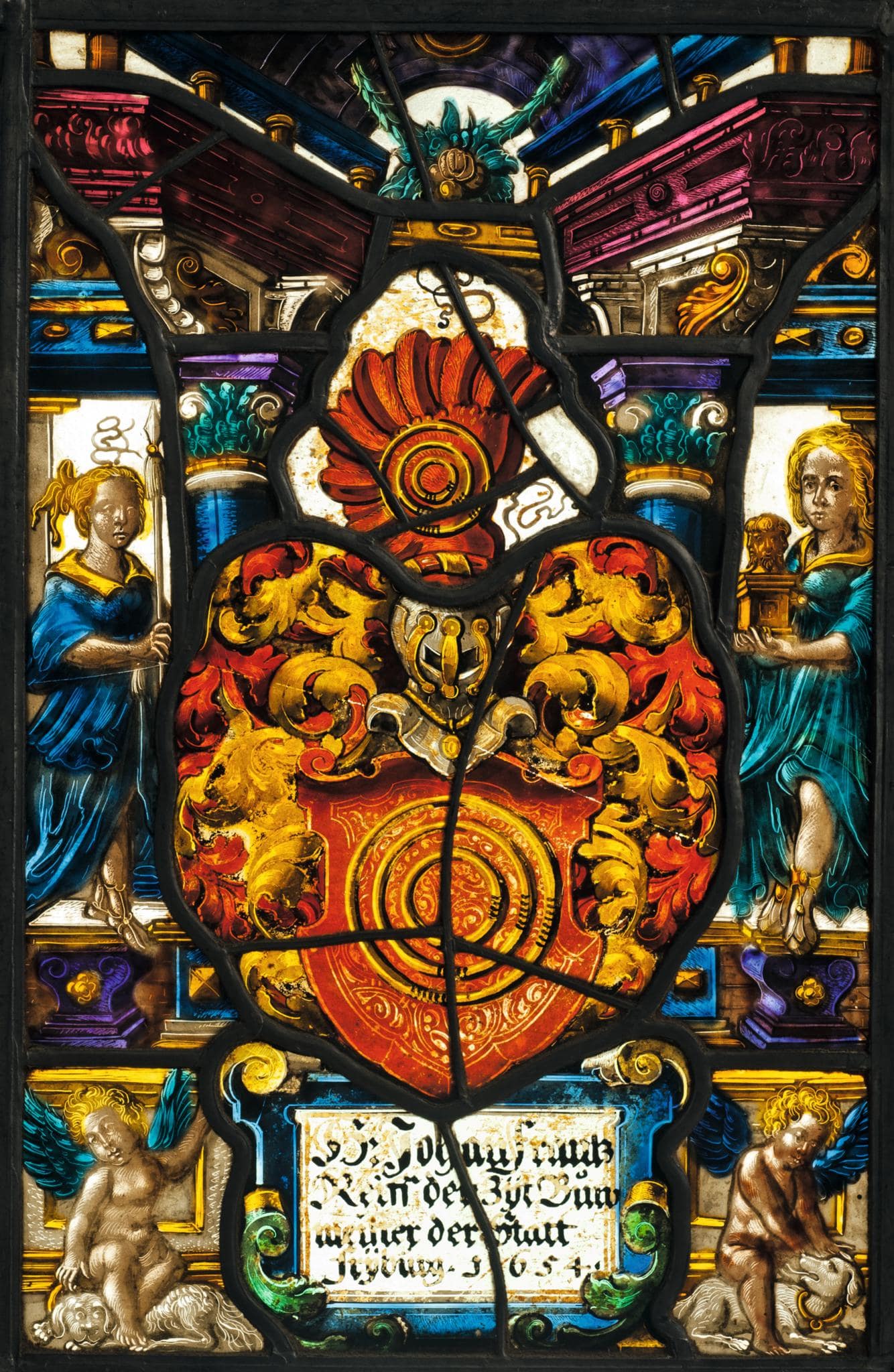 Das Wappen mit Helmdecke, Helm und Helmzier schwebt vor farblosem schnurverziertem Grund über der Inschrifttafel. Der restliche Teil der Scheibe wurde in jüngerer Zeit ergänzt. Über den Podesten, vor denen zwei Putten auf Hunden sitzen, stehen zwei weibliche Tugendallegorien, links Victoria (?) mit der Lanze, rechts Sapientia (?) mit der Statuette eines Dreigesichts (Trivultus) in den Händen. Die Säulen und Pilaster der dreiachsigen Architektur tragen ein perspektivisch verkürztes Gebälk, über dem ein Tonnengewölbe auf einer Balustrade ansetzt.