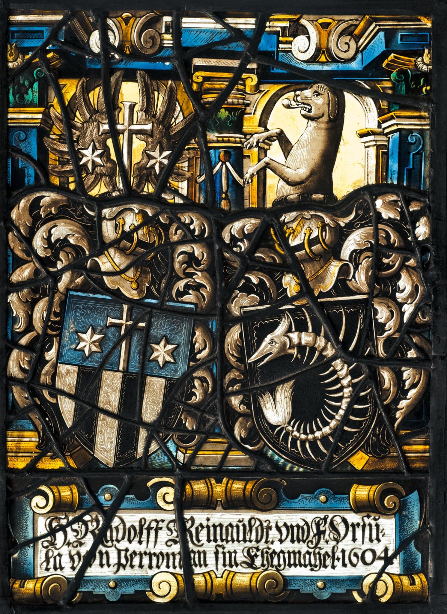 Stifterinschrift (ergänzt): H. Rudolff Reinauldt. vnd F. Vrsu= / la von Perroman sin Ehegmahel. 1604.