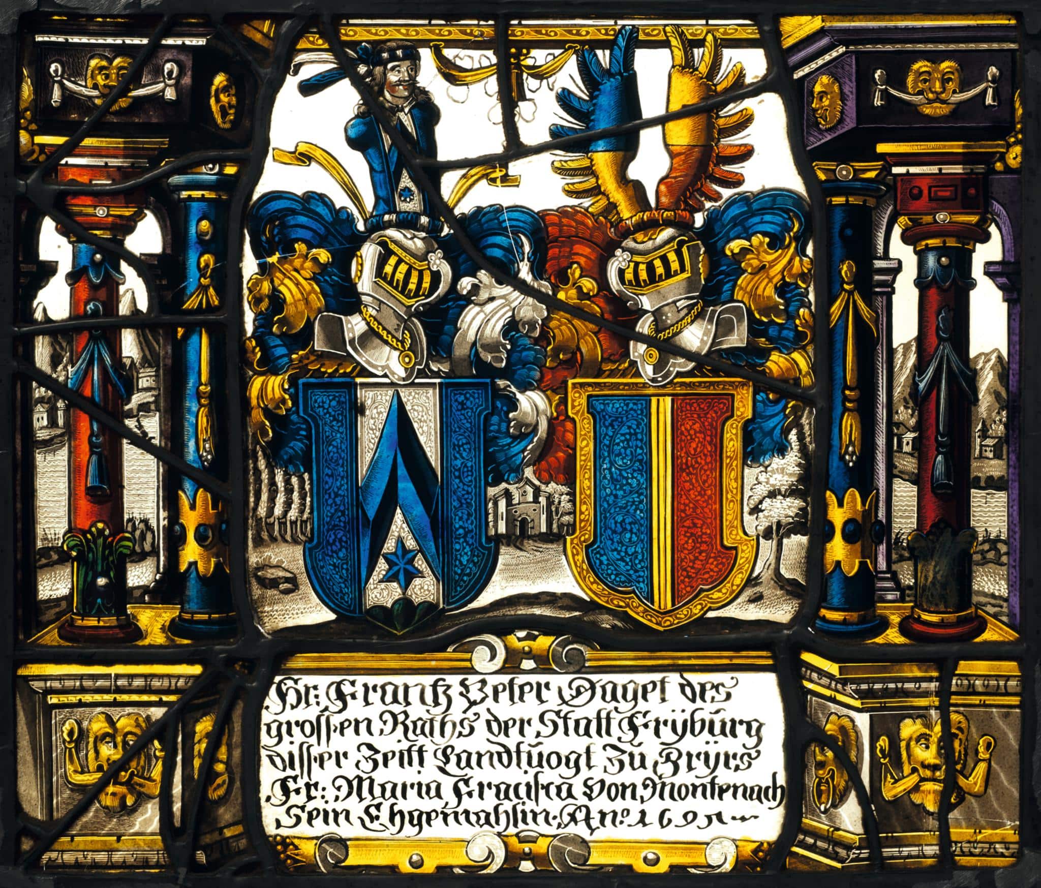 Stifterinschrift: Hr: Frantz Peter Daget des / grossen Raths der Statt Frÿburg / disser Zeitt Landtuogt zu Grÿers / Fr: Maria Fracisca von Montenach / Sein Ehgemahlin. Ano. 1695.