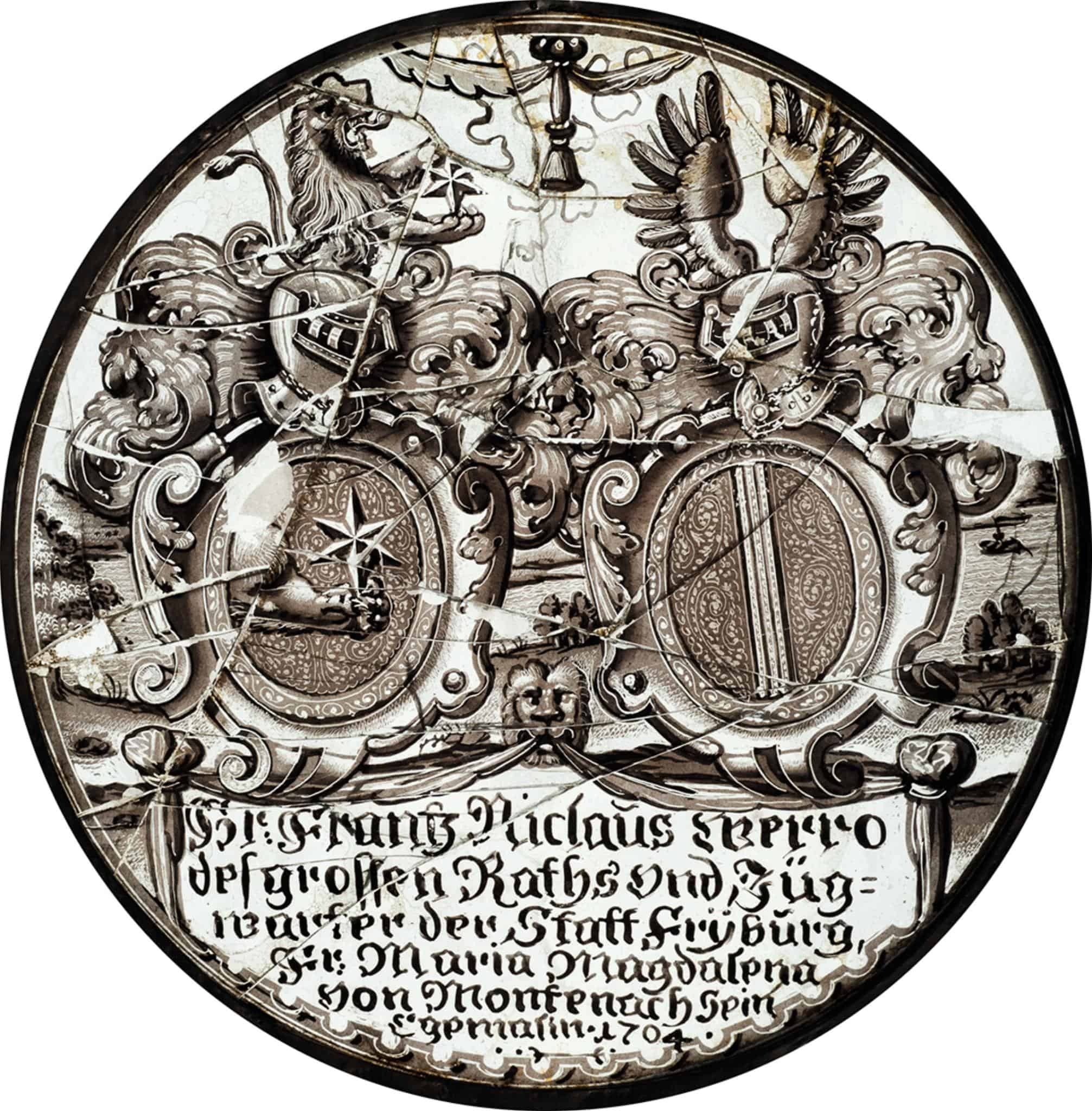 Stifterinschrift: Hr: Frantz Niclaus Werro / des grossen Raths vnd Züg= / warter der Statt Frÿburg, / Fr: Maria Magdalena / von Montenach Sein / Egemalin. 1704.