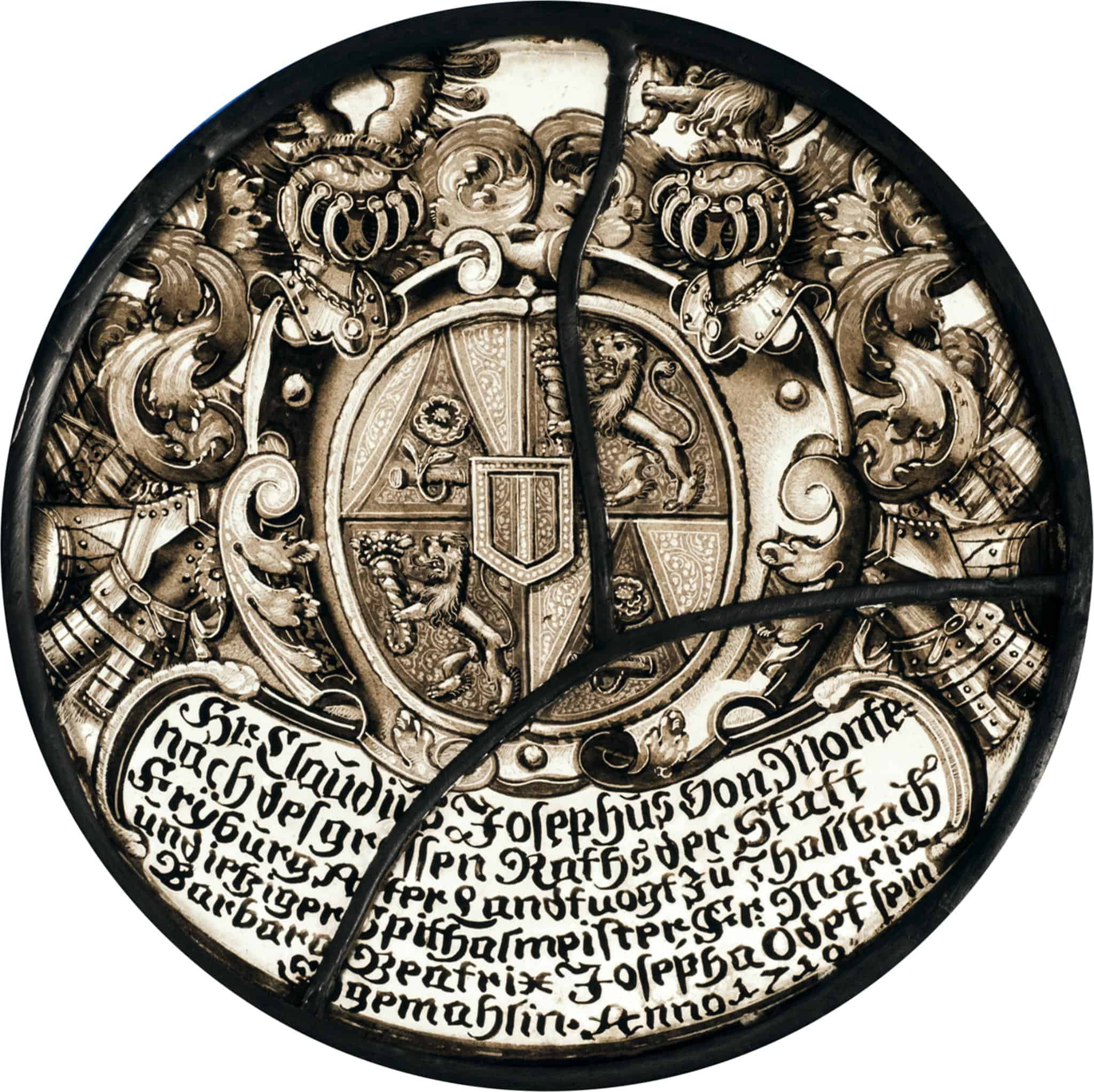 Bergmann, U. (2016). Wappenscheibe Claude Joseph von Montenach und Maria Barbara Beatrix Josepha Odet 1710 · Vitrail d’alliance aux armes de Montenach – Odet. Dans Vitrosearch. Consulté le 5 décembre 2025 de https://www.vitrosearch.ch/objects/2567228.