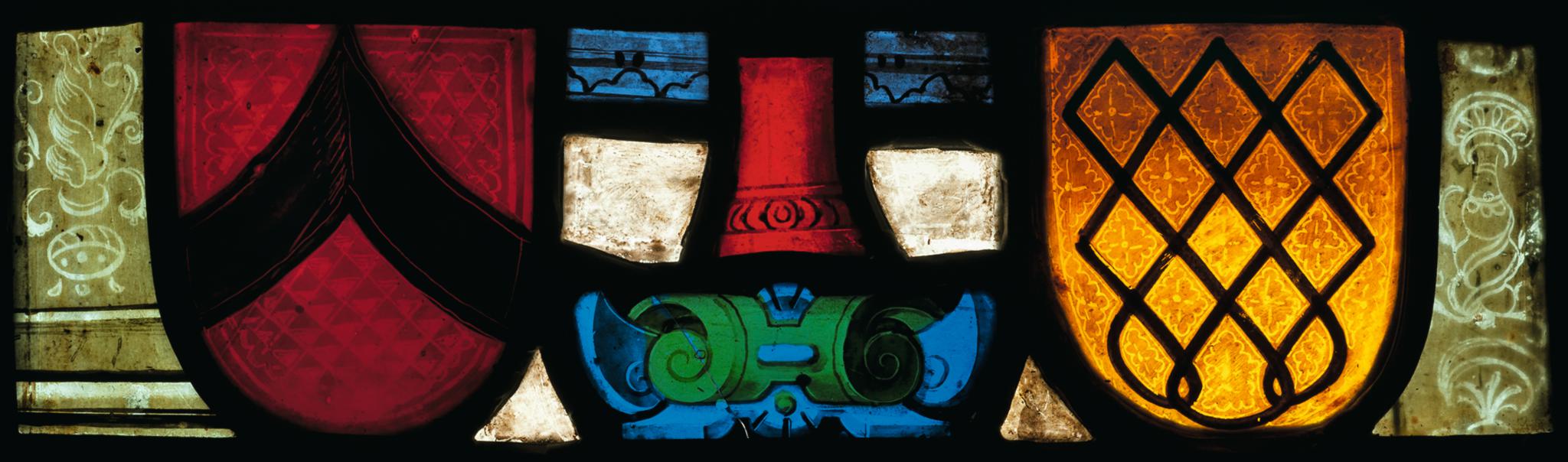 Das querrechteckige Scheibchen mit zwei unbekannten Wappen ist aus unterschiedlichen Fragmenten zusammengesetzt.