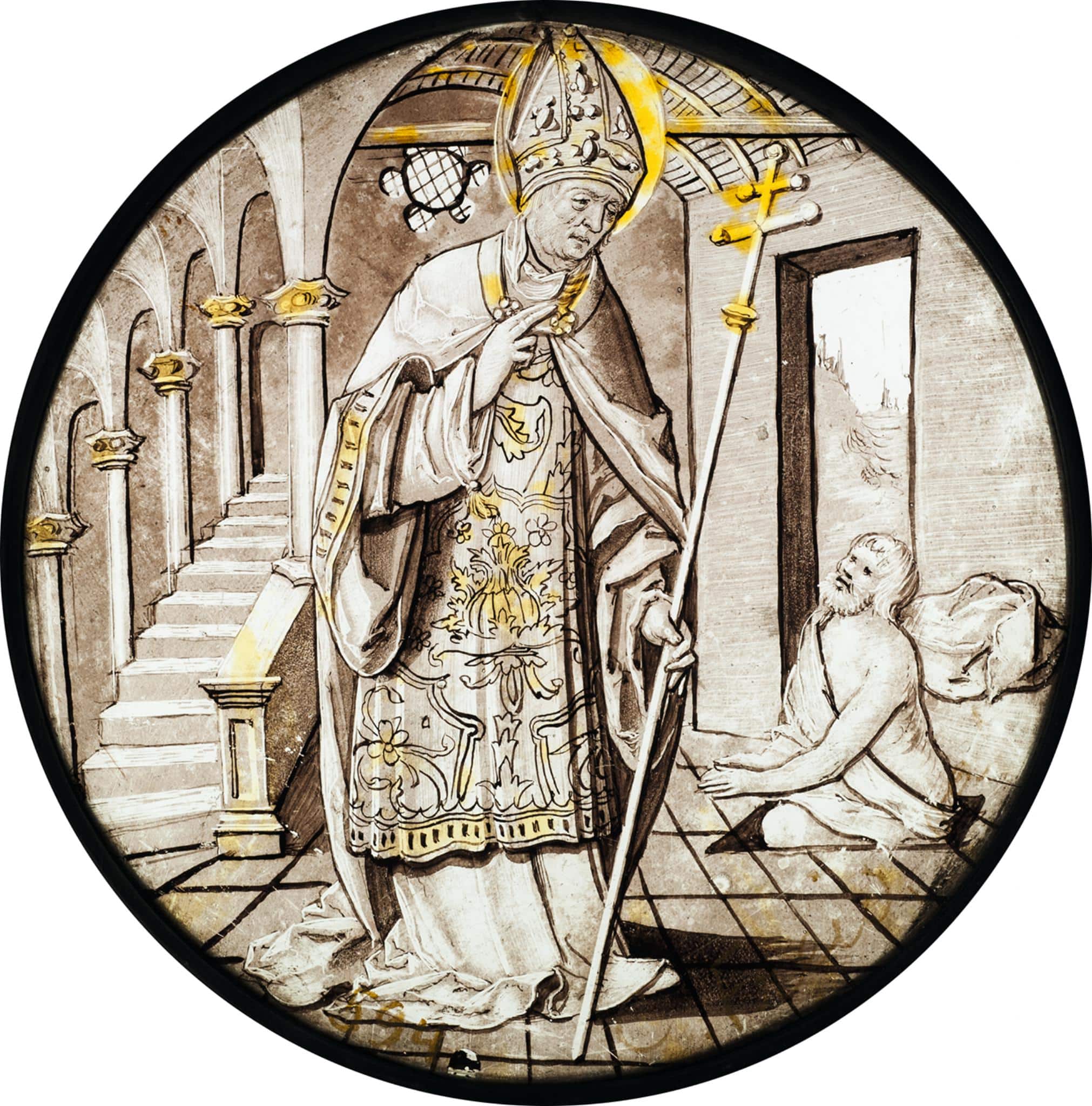 Die Identifizierung des Heiligen ist nicht geklärt. Bekannt sind sehr ähnliche Scheiben, die ebenfalls einen Bischof darstellen, der einen Menschen aus dem Grabe erweckt, und mit oder ohne Bezeichnung "S Claude" versehen sind (Husband. 1991. S. 40 und 42 [Hillsborough, Kalifornien, Privatbesitz]; Bergmann 2014. Bd. 2, Abb. 298.1 und 343.1). Der hl. Claude, Bischof von Besançon (vgl. VMR_278), einer der wichtigsten Heiligen Frankreichs, hatte zwei im Doubs ertrunkene Kinder wieder ins Leben geholt. Da auf der vorliegenden Scheibe der vom Tode Auferweckte aber als bärtiger Erwachsener und nicht als Kind oder Jugendlicher dargestellt ist, kann die Identifizierung des hl. Bischofs mit Claudius nicht als gesichert gelten. In Frage käme auch der hl. Bischof Stanislaus (* 1035) aus polnischem Adel. In Gnesen und Paris erzogen, wurde er Priester in Krakau, wo er 1072 den Bischofsitz einnahm. Weil er König Boleslaw II. mehrfach der Grausamkeit und Unsittlichkeit bezichtigte, wurde er 1079 von ihm eigenhändig am Altar ermordet. Wie der hl. Fridolin hatte auch Stanislaus einen Toten als Zeugen für einen Rechtsstreit um den Erwerb eines Kirchengrundstücks ins Leben zurückgeholt. Der Auferweckte wurde zum Attribut des Heiligen, der vor allem im osteuropäischen Raum, vereinzelt aber auch in Österreich, Deutschland und Italien verehrt wurde. Die mutmassliche stilistische Herkunft der Scheibe aus dem niederländischen oder französischen Raum dürfte dennoch eher für eine Darstellung des hl. Claudius von Besançon sprechen.