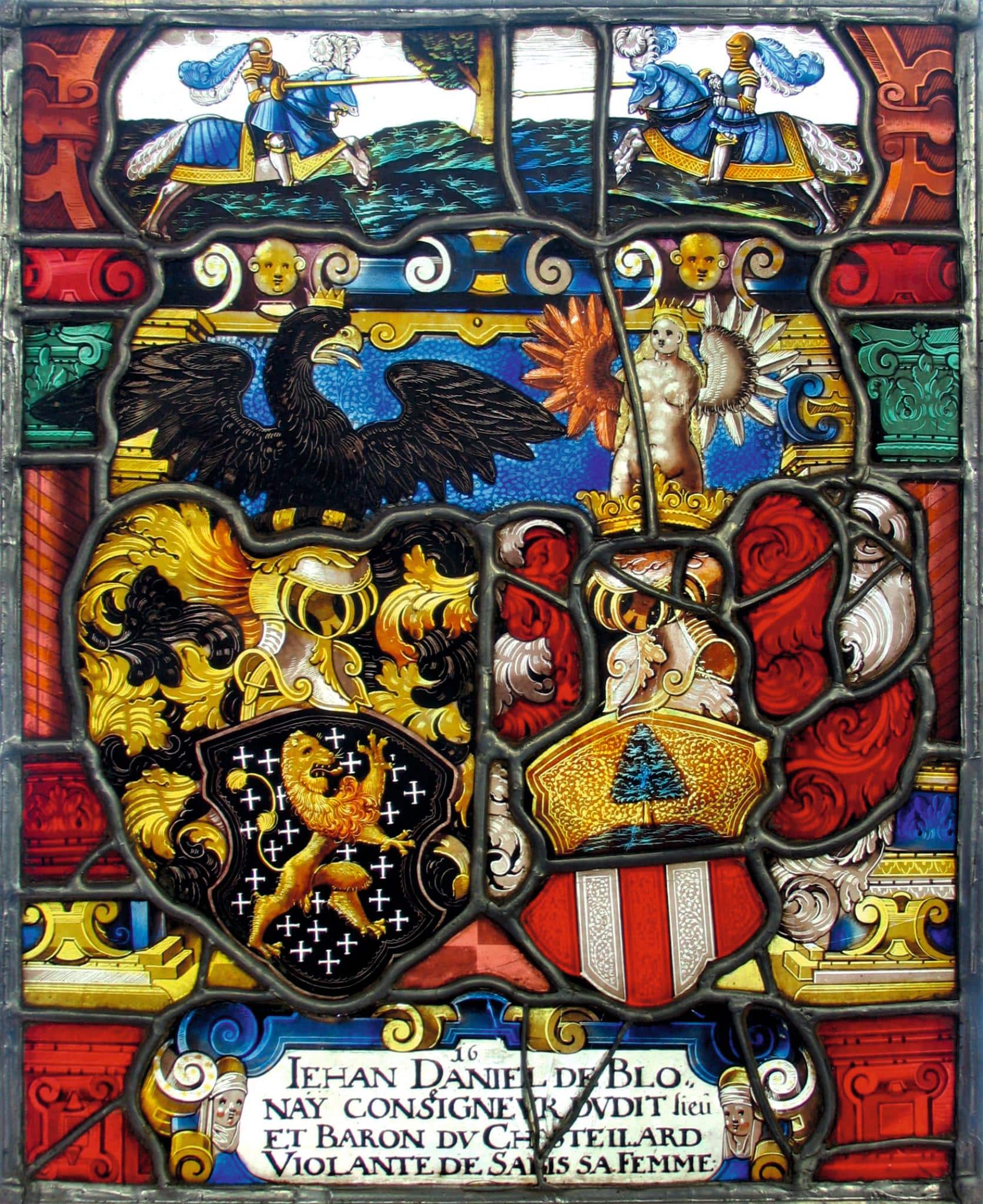 Stifterinschrift: 16 / Iehan Daniel de Blo,, / naÿ conseignevr dvdit lieü / et Baron dv Chasteilard / Violante de Salis sa Femme.
