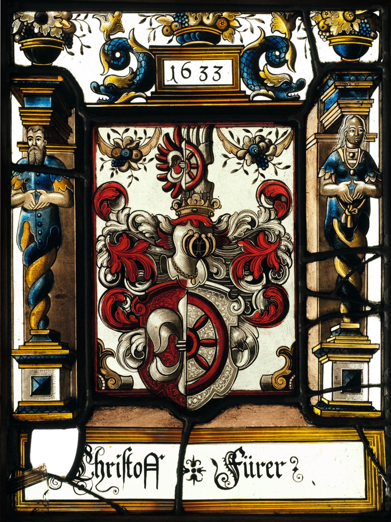 Das volle Wappen der Familie Fürer steht in einem Rechteckrahmen, der unten mit Rollwerkmotiven, oben mit Fruchtgehängen verziert ist. Vor den seitlichen Rahmenpilastern entwächst torsadierten Säulen links eine männliche, rechts eine weibliche Hermenfigur. Sie stützen die Kapitelle, auf denen Fruchtvasen stehen. Über dem Mittelbild trägt ein kleines, von Delphinen begleitetes Podest eine Fruchtvase und auf seiner Vorderseite die Jahrzahl 1633. Am Fuss der Scheibe enthält eine schlichte Inschrifttafel den Namen des Stifters.