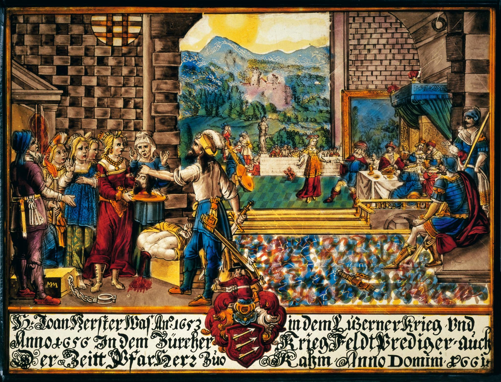 Im linken Teil der Bildscheibe empfängt Salome in Begleitung ihrer Hofdamen das Haupt des hl. Johannes Baptista, das ihr der Henker auf die dargereichte Schüssel legt (Mt 14, 3–12). Auf einem Steinblock liegt zwischen ihnen, die Hände auf dem Rücken gefesselt, der Körper des Hingerichteten, aus dessen Halsstumpf noch das Blut strömt. Auf die vorausgehende Gefangenhaltung des Heiligen weist am linken Bildrand ein die Gefängnisschlüssel tragender Wärter hin, der vor einem weiteren Steinblock mit Eisenkette steht. Im rechten Bildteil geht der Blick in den Palast des Herodes, in dem vor einem grossen Wandteppich und unter einem Baldachin das Festgelage stattfindet. Den rechten Abschluss bilden zwei antikisch gekleidete Wärter, die im Vordergrund in einem mit Marmorfliesen ausgelegten Vorraum sitzen. Begleitet von Musikanten führt in der Bildmitte Salome vor dem elterlichen Herrscherpaar und der Tafelgesellschaft ihren Tanz auf. Hinter einer niedrigen Parkmauer, auf der eine Statue der Diana steht, hat sich eine grosse Menge Zuschauer versammelt. Den Hintergrund nimmt eine weite, gebirgige Landschaft mit Burg ein.