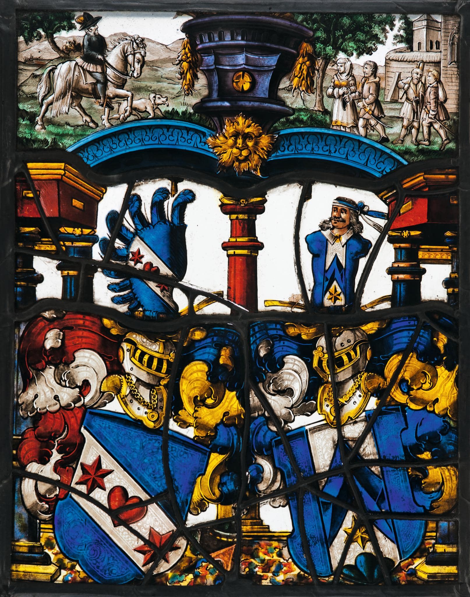 Vor einer zweiachsigen Architektur mit einer stützenden Mittelsäule und perspektivisch verkürztem Architrav stehen auf marmoriertem Boden die beiden Stifterwappen. Die Inschrift ist verloren. Das Oberbild über den blauen Flachbögen, das einen Reiter zeigt, der vor einer befestigten Ortschaft von seiner Familie empfangen wird, wurde im 19. Jahrhundert hinzugefügt.