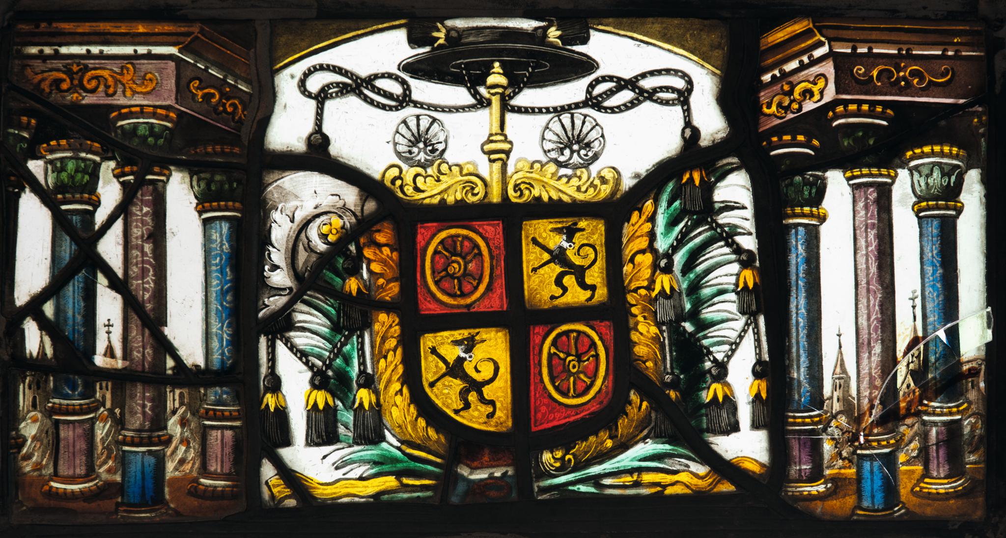 Über Palmblättern erscheint das mit Blättern umgebene und vom Protonotariushut überhöhte Wappen des Stifters vor farblosem Grund. Der senkrecht durchgesteckte Stab ist seitlich mit Muscheln über Blattranken geschmückt. Die offene Rahmenarchitektur mit drei marmorierten Säulchen, die ein rankengeschmücktes Gebälk tragen, gibt den Blick auf eine Grisaillelandschaft mit Kirchenbauten frei. Die Inschrift fehlt.