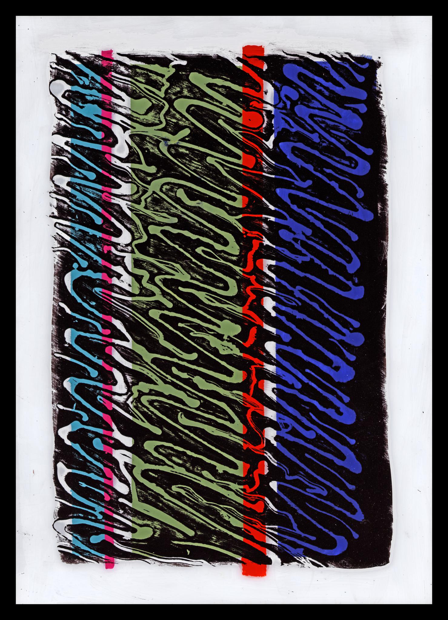 Dieses Hinterglasbild weist Techniken auf, die Jochem Poengsen im Sommer 2013 auf Papierarbeiten anwendete. Die Tusch- und Aquarellzeichnungen schuf er mittels einer Maskierflüssigkeit, die ihm erlaubte, mehrere Farbschichten übereinander zu legen und zahlreiche Parallelen zur Technik der Hinterglasmalerei zu ziehen. Diese Experimente lösten in ihm den Wunsch aus, diese neuen Möglichkeiten auf Glas zu erproben.
