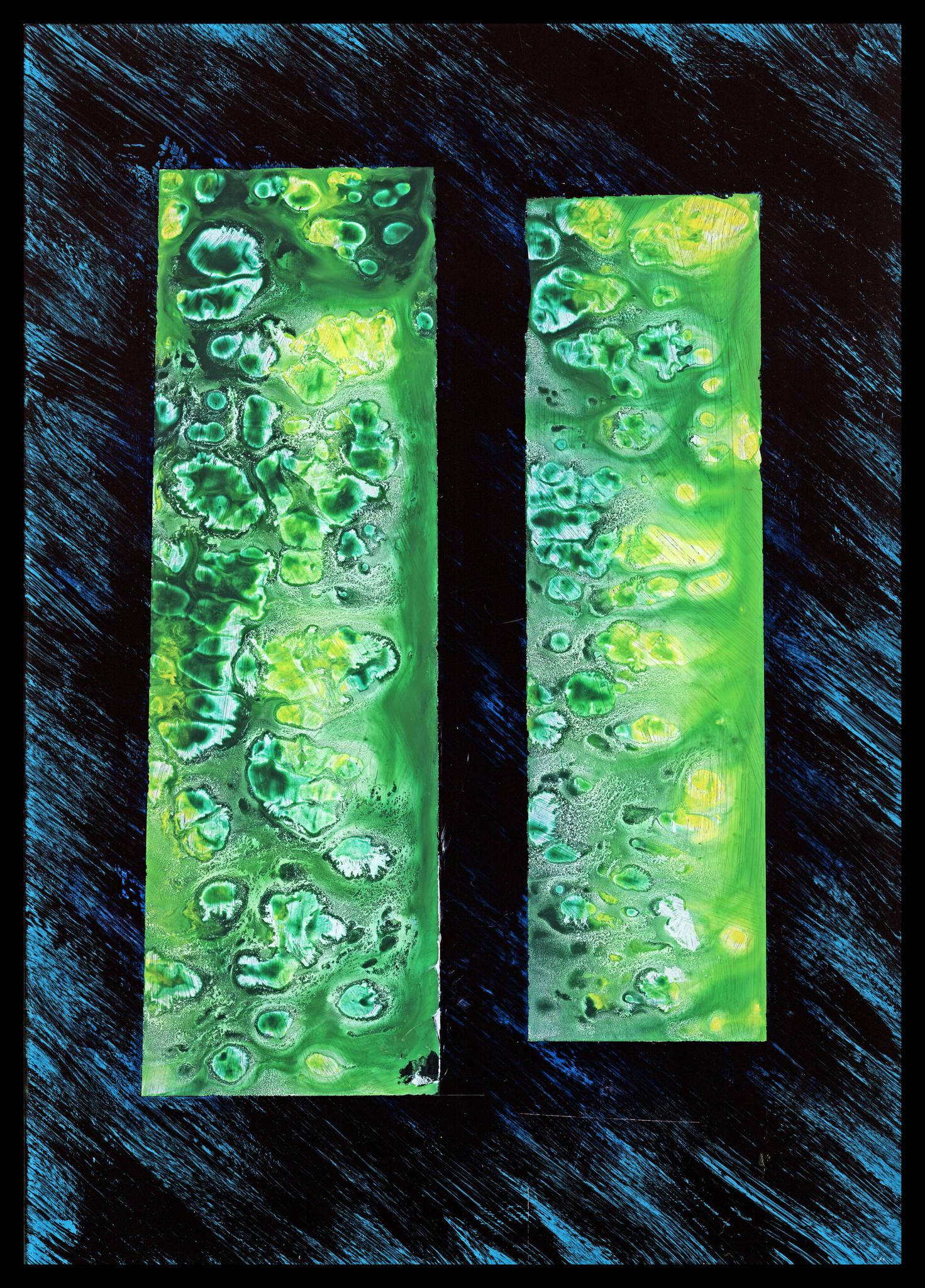 Schwarze und blaue Deckfarben; in den Rechteckformen nach Entfernung der Abdeckfolie gelbe und grüne Acrylfarben in Nass-in-Nass-Technik, als rückwärtiger Abschluss Ölfarbe