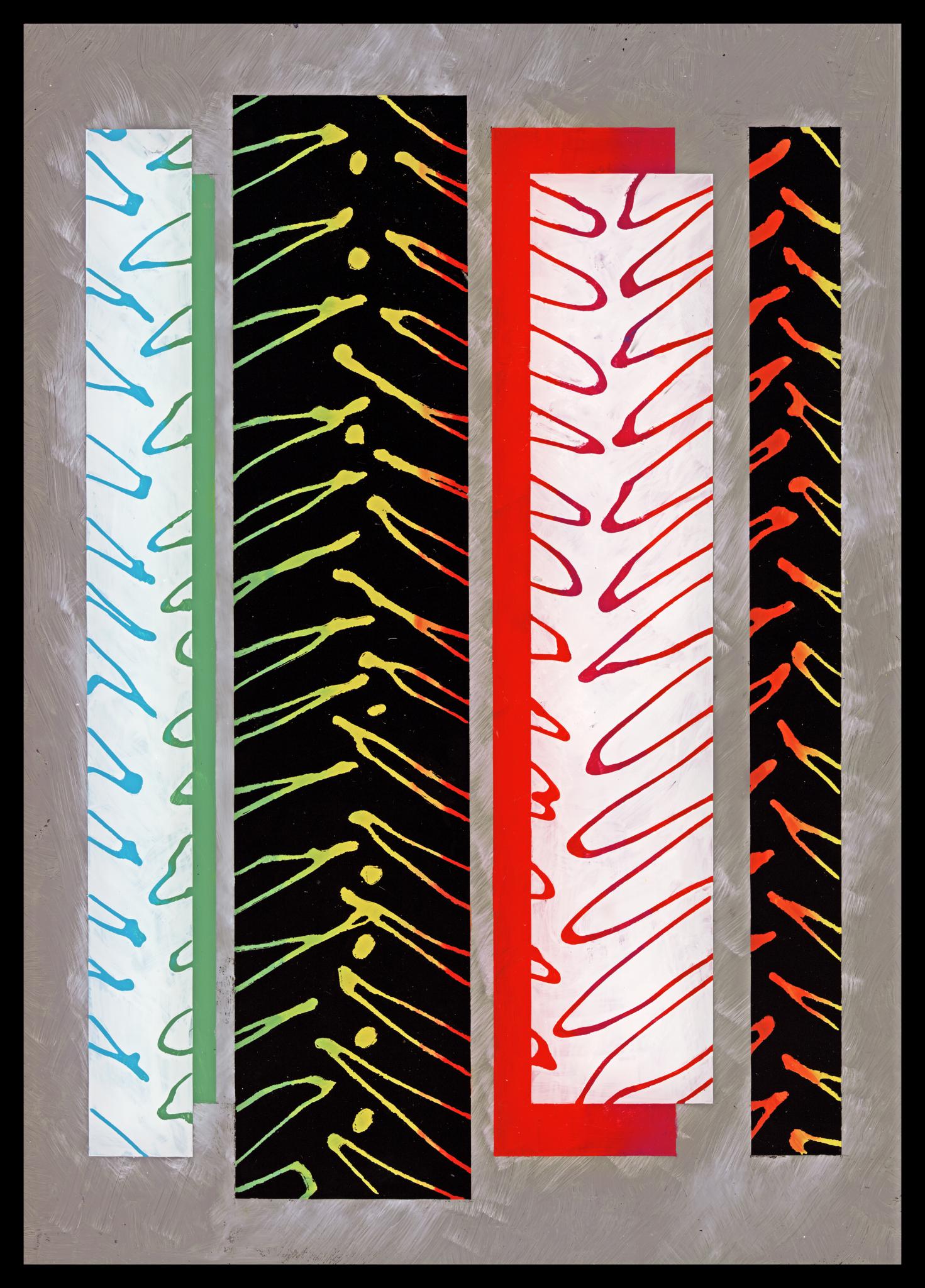 Maskierstift (nach dem Trocknen mit schwarzer und weißer Deckfarbe übermalt und weggerubbelt), mit Ölfarben übermalt