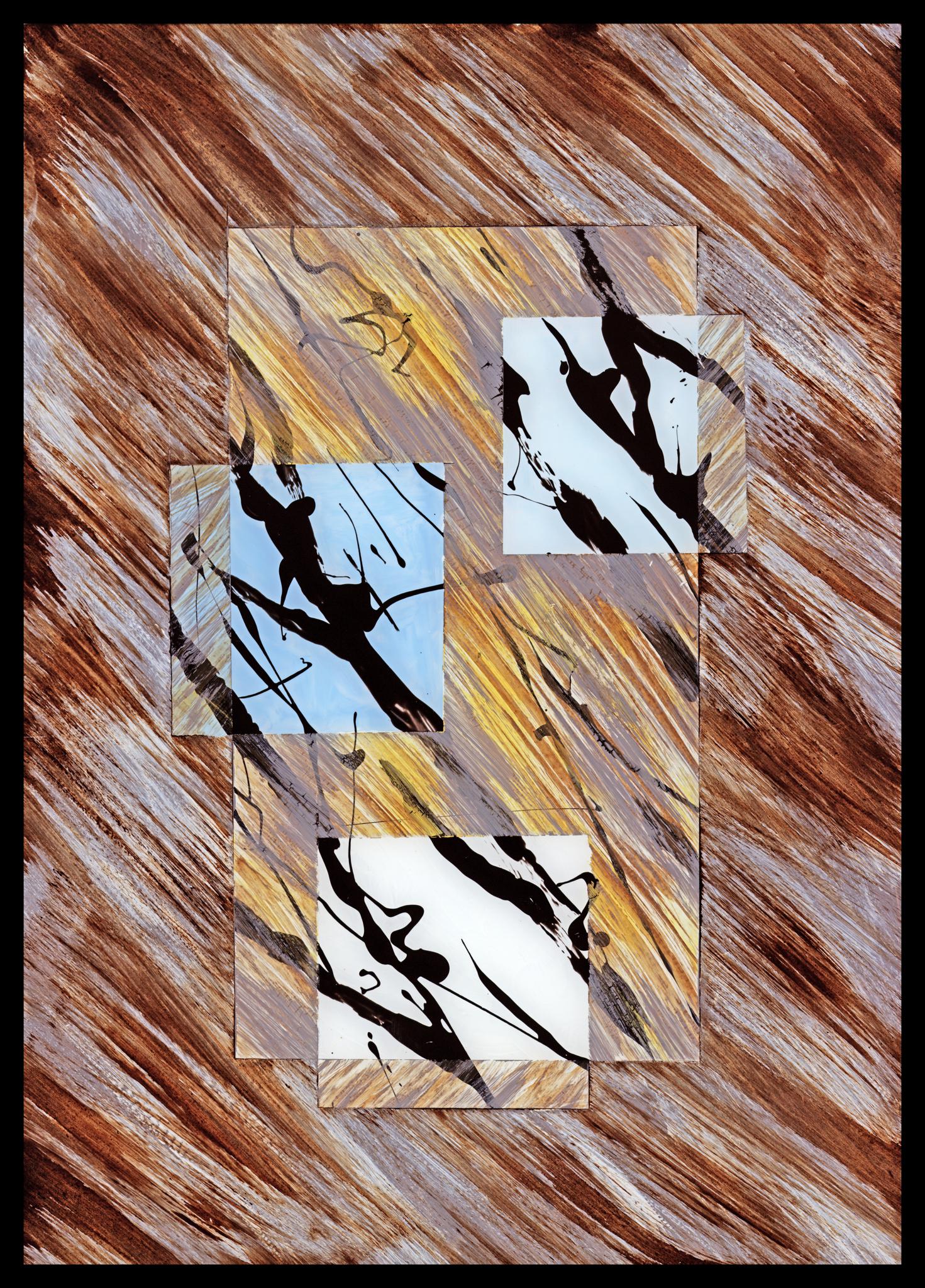 In mehreren Arbeitsgängen partielle Folienabdeckung, Deckfarben, mit Asphaltlack übermalt