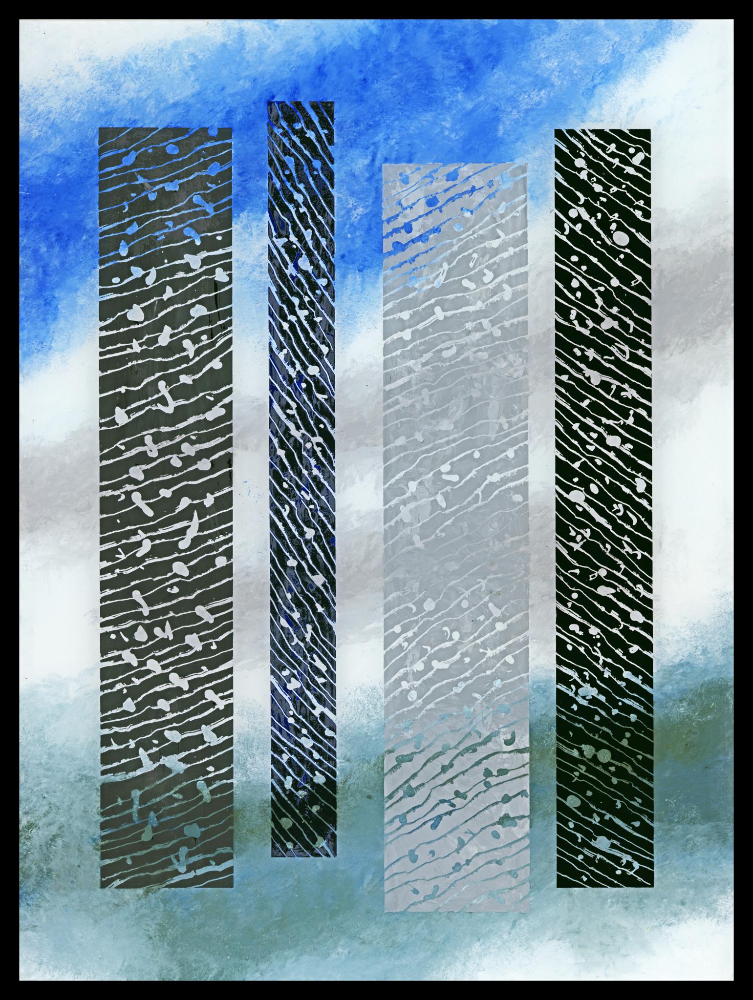 In den Rechteckflächen Maskierstift (nach dem Trocknen mit dunkelblauer, grauer und schwarzer Deckfarbe übermalt und weggerubbelt), mit Ölfarben übermalt