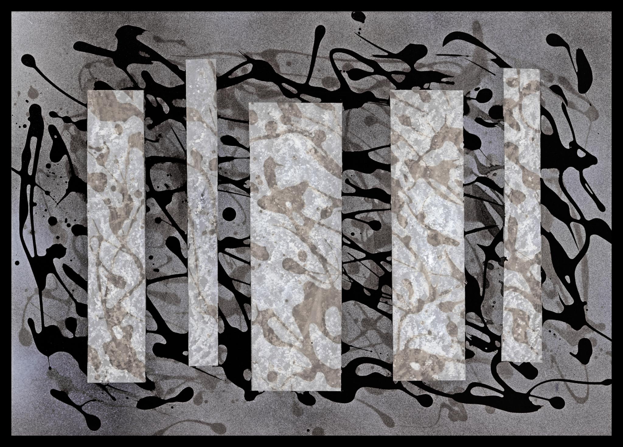 In den Rechteckflächen hellgraue Deckfarbe; Asphaltlack in Dripping-Technik, der durch die Deckfarbenflächen durchschlägt, rückwärtiger Abschluss ganzflächig weißer und schwarzer Acrylfarbspray