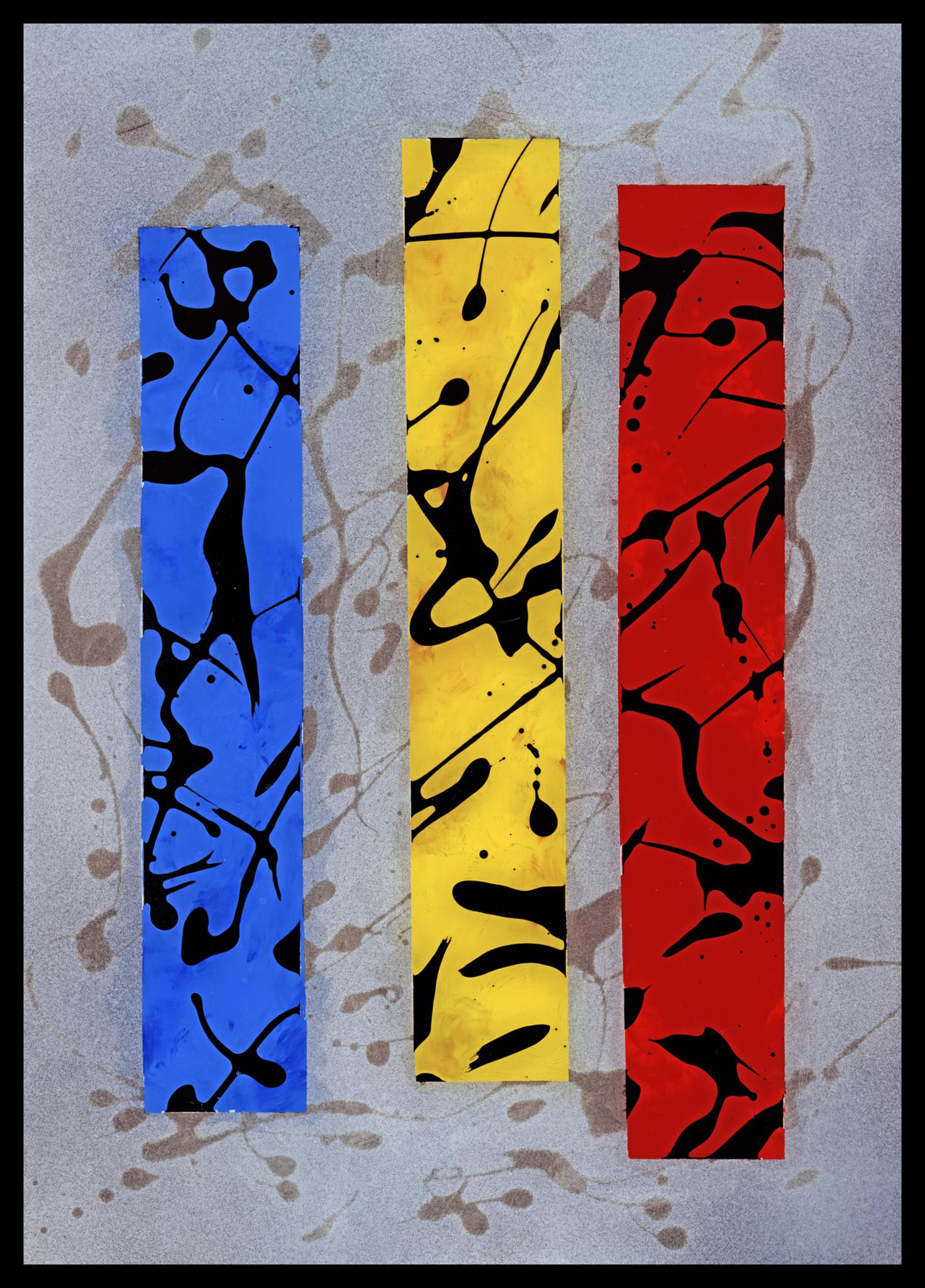 In den Rechteckflächen Asphaltlack in Dripping-Technik, mit blauer, gelber und roter Deckfarbe übermalt; ganzflächig graue Deckfarbe, Asphaltlack in Dripping-Technik, der durch die grauen Flächen durchschlägt