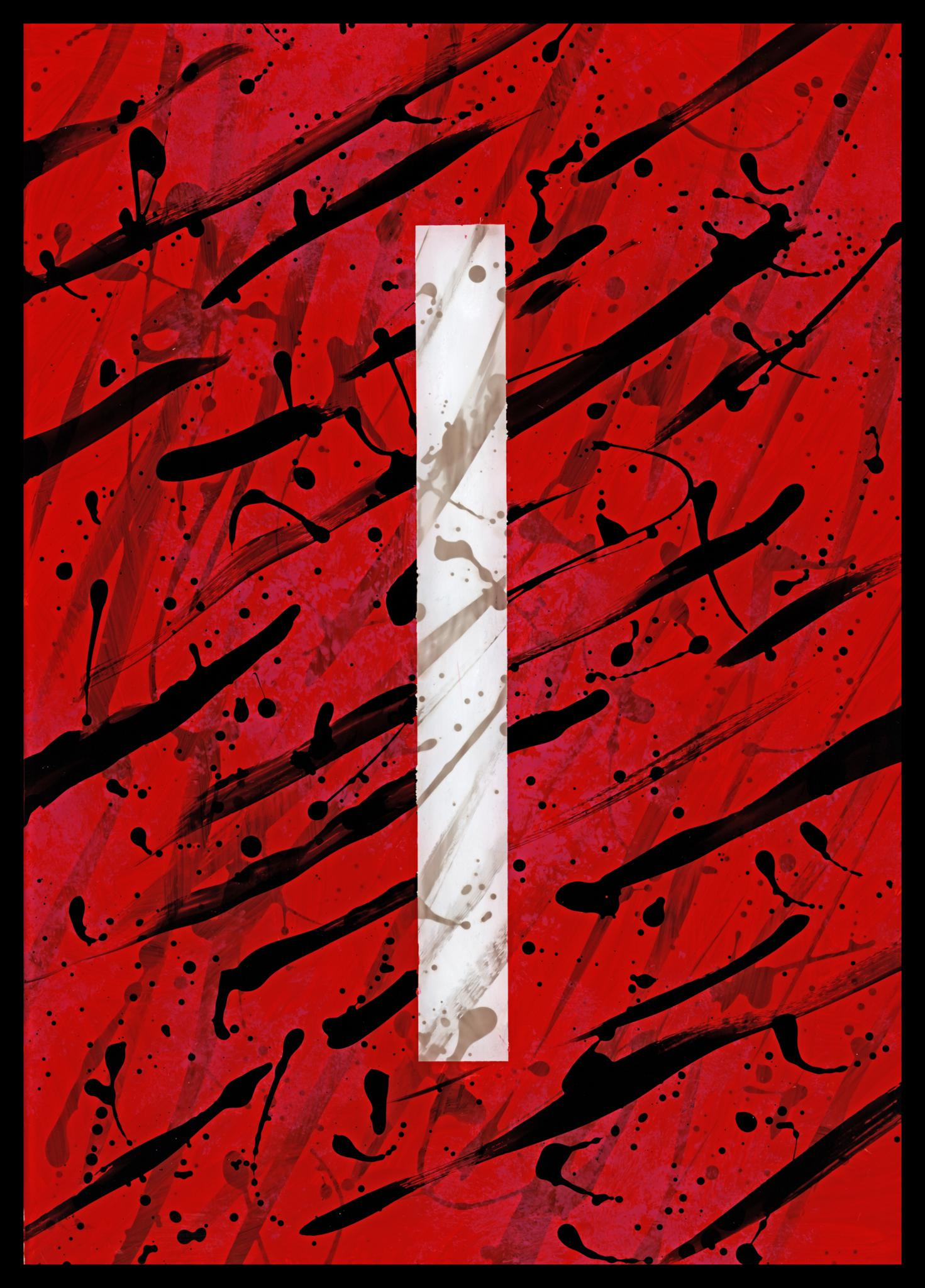 In der rechteckigen Fläche weiße Deckfarbe, ganzflächig gestische Asphaltlack-Malerei, mit roter Deckfarbe übermalt, danach Asphaltlack in Dripping-Technik, der durch die vorderen Farbschichten durchschlägt