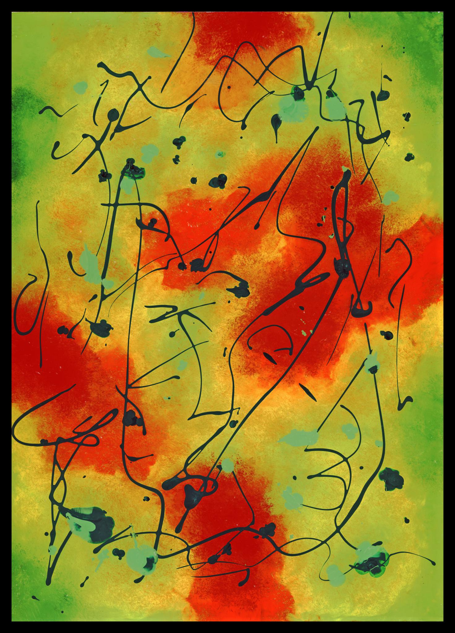 Asphaltlack in Dripping-Technik, mit Ölfarben übermalt