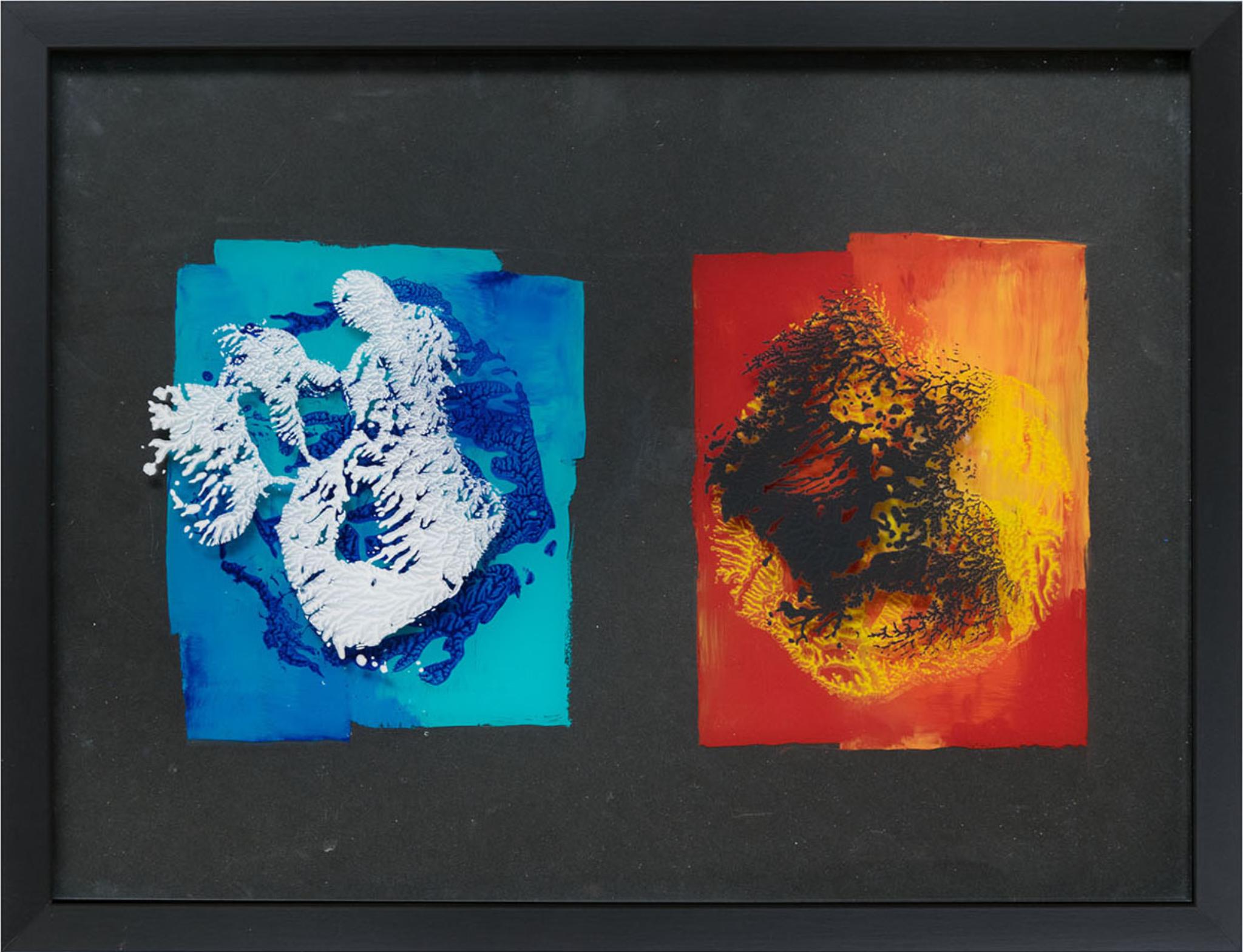 Mehrschichtenbilder, die aus mehreren gemalten Glasplatten bestehen und die auch Kulissenbilder genannt werden, sind seit dem 17. Jahrhundert bekannt. Sie blieben aber wegen ihrer aufwendigen Herstellungsart seltene Werke. Irritiert dadurch, dass beim Hinterglasmalen die haptische Qualität der Farbmaterie verloren geht, erprobt Jochem Poensgen verschiedene Mittel, um die Materialität der pastosen Farbmasse wiederzugeben. Beim Zweischichtenbild 15/2016 hat er im Abklatschverfahren gearbeitet: dabei werden die Farben auf einer Glasplatte verteilt, danach eine zweite Glasscheibe darauf abgedrückt und mehrmals hochgehoben, bevor die Farbe trocken ist. Es reizen ihn die dabei erzeugten, unkontrollierbaren Effekte, denen er in früheren Schaffensphasen bei Radierungen und Glasbildern nachgegangen war. Er erlebt es als Herausforderung, auf solche, aus seiner Kontrolle geratene Verfahren zu reagieren und das Bild als harmonische, durchdachte Komposition zu vollenden.