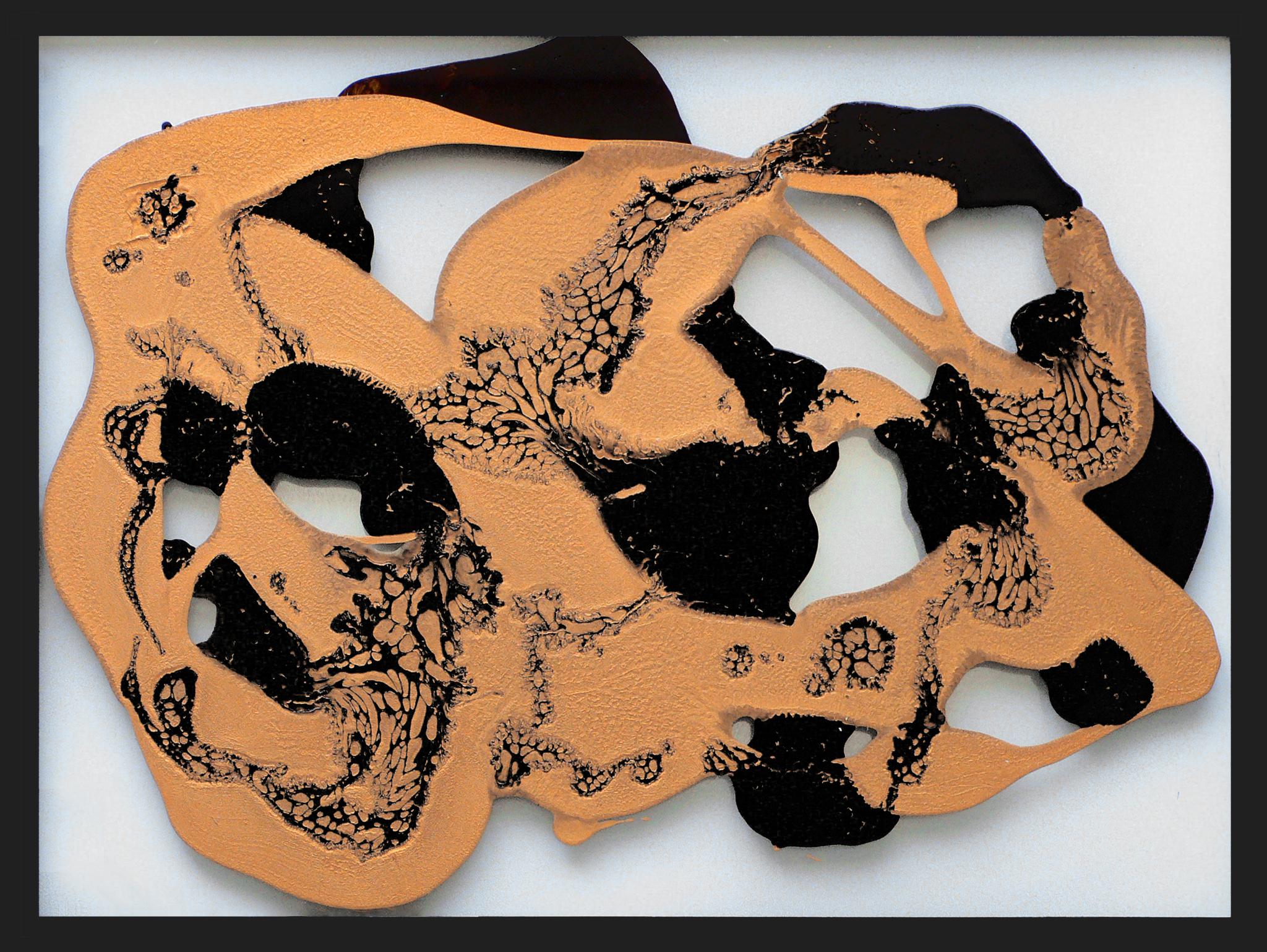 Poensgens Interesse am Zusammenspiel von Transparenz und Opazität, Spiegelungen und Schatten, führte den Künstler dazu, Gemälde zu schaffen, die aus zwei oder drei Glastafeln zusammengesetzt sind. Solche Mehrschichtenbilder oder sogenannte Kulissenbilder sind seit dem 17. Jahrhundert bekannt, blieben aber wegen ihrer aufwendigen Herstellungsart seltene Werke. In Poensgens Bildern gehen Malerei und räumliche Effekte eine gelungene, subtile Synthese ein. Der spontane gestische Asphaltlack-Auftrag auf den Scheiben des hier vorgestellten Mehrschichtenbilds zeichnet sich als Schatten auf den tieferen Schichten ab, der sich mit der Bewegung des Betrachters verschiebt. Die abschliessende Platte des Hintergrundes ist ein Spiegel (siehe auch PSV_2221 und PSV_2223).
