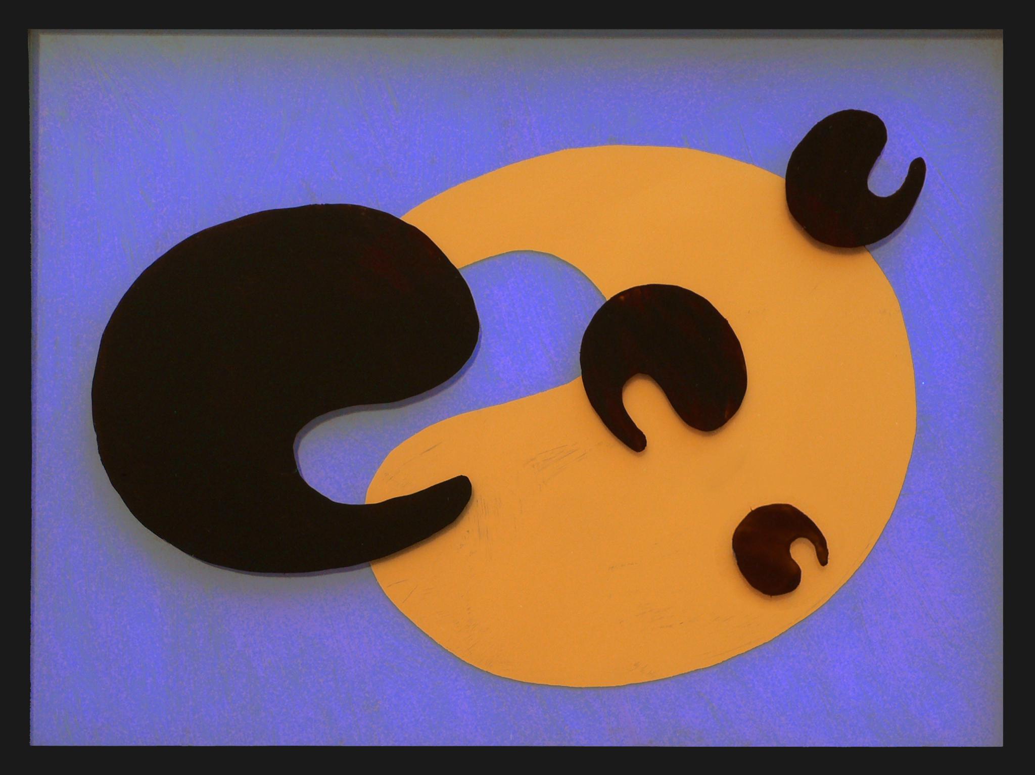 Auf der vorderen Glastafel mehrfach in unterschiedlichen Größen wiederholte Form in Asphaltlack (Stencil-Technik), auf der Vorderseite der hinteren Glastafel die gleiche Form vergrößert in goldene Metallglanzfarbe (Stencil-Technik), auf der Rückseite der hinteren Glastafel ganzflächig blaue Deckfarbe
