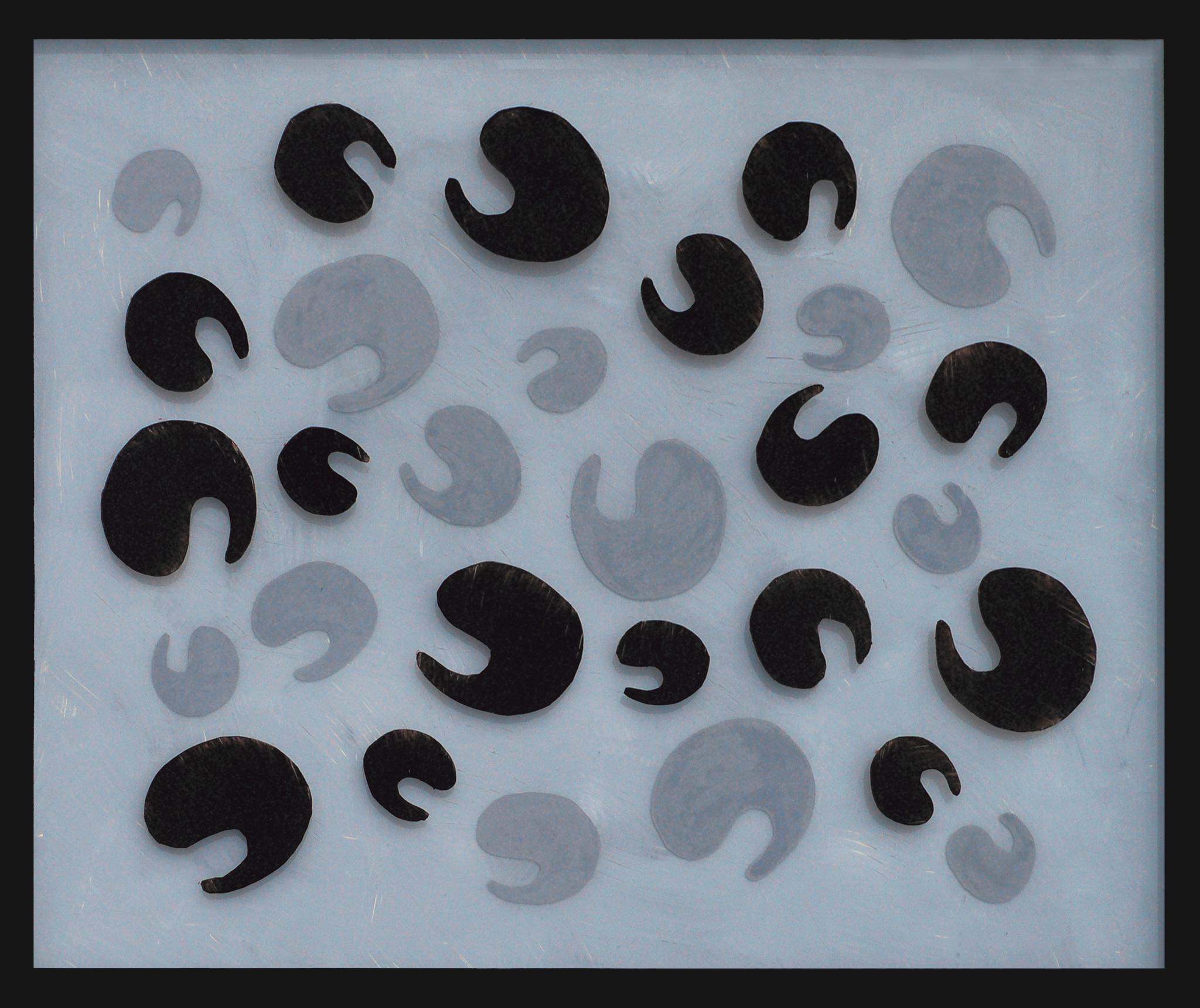 Interpretationsoffene Malerei. Das Hinterglasbild besteht aus zwei Glastafeln (vordere Glastafel thermisch verformtes mundgeblasenes Flachglas, um harte und scharfe Spiegelungen zu vermeiden; hintere Glastafel Floatglas). Diese sind in einem Abstand von 5 mm hinter einander gestellt und durch eine schwarze Holzleiste getrennt. Dem Bild wird dadurch eine räumliche Tiefenwirkung verliehen.