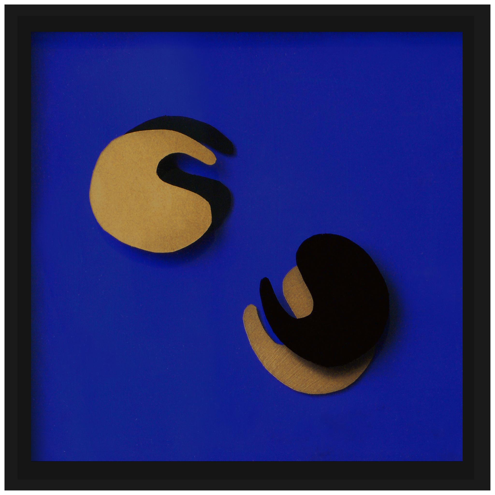 Auf der vorderen Glastafel zwei Formen aus goldener Metallglanzfarbe und aus Asphaltlack in Stencil-Technik; auf der Vorderseite der hinteren Glastafel die gleichen Formen aber formal und farbig diagonal gespiegelt; Rückseite der hinteren Glastafel: blaue Deckfarbe