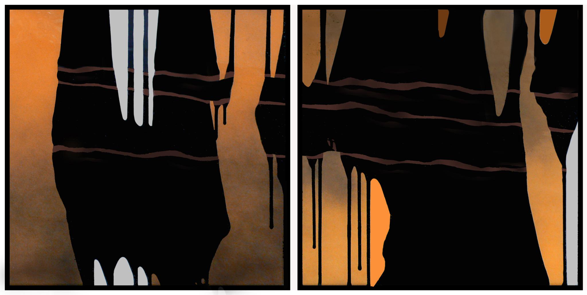 Interpretationsoffene Malerei. Zweiteiliges Gruppenbild, die Glastafeln sind thermisch verformtes mundgeblasenes Flachglas, um harte und scharfe Spiegelungen zu vermeiden. Der Abstand der Bilder zueinander ist durch das Foto definiert.