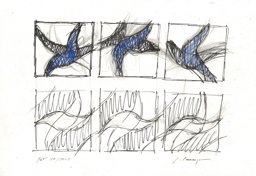 Eine Reihe von Hinterglasbilder (16/2018 bis 27/2018) sind nach einem Besuch des Künstlers im Stralsunder Ozeaneum im Frühjahr 2018 entstanden. Vor allem Rochen, die sich mit flügelartigen Schlägen ihrer Brustflossen fortbewegen, haben ihn fasziniert. Ihre eleganten wellenförmigen Schwimmbewegungen erinnern ihn an Flugbewegungen grosser Vögel und inspirierten ihn zum Beispiel zu diesem Bild. (Siehe auch PSV_2238).