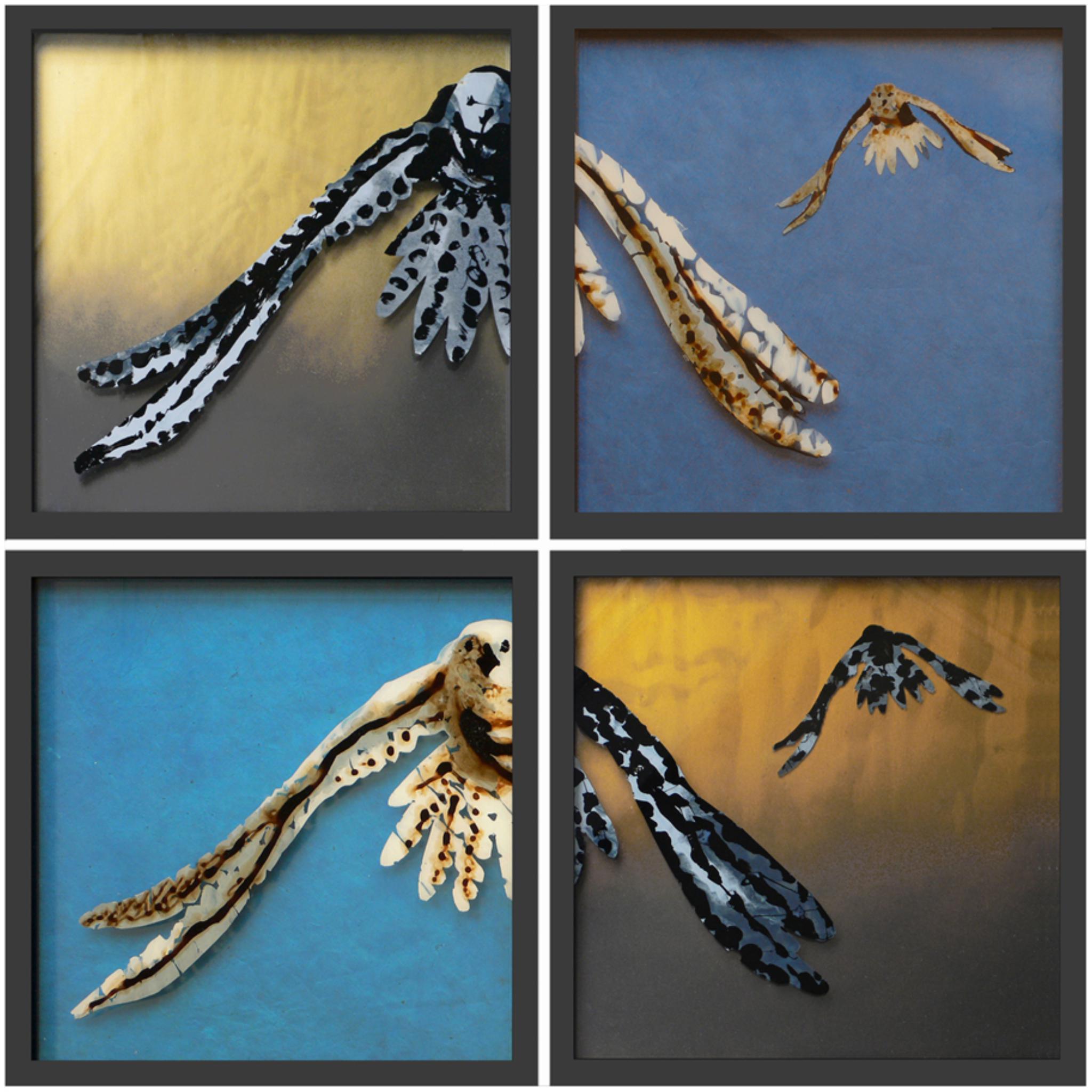 Zweiteiliges Gruppenbild, der Abstand der Bilder zueinander ist durch das Foto definiert. Es stellt zwei schwarz-graue und zwei gold-braune Vögel, Adler ähnelnd, dar, die mit augebreiteten Flügeln vor einem blau-gelbgoldenen Himmels-Hintergund schweben. Jedes Hinterglasbild besteht aus jeweils zwei Glastafeln (Floatglas). Die Glastafeln sind in einem Abstand von 5 mm hintereinandergestellt und durch eine schwarze Holzleiste getrennt. Dem Bild wird dadurch eine räumliche Tiefenwirkung verliehen.