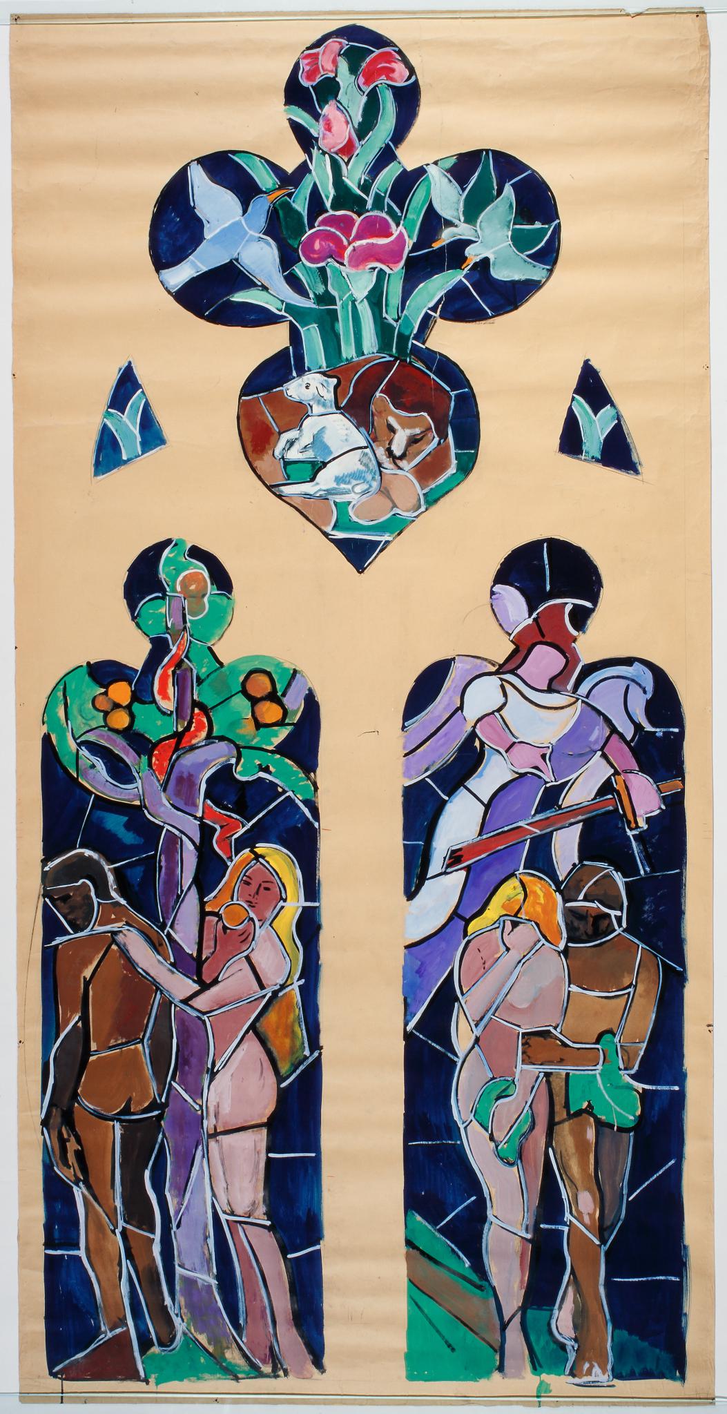 Ce carton en couleur est le dessin précis à l’échelle 1:1 pour les deux fenêtres hautes à gauche dans la nef du temple de Coppet : le vitrail de la deuxième ouverture pour la partie basse figurant Adam et Eve et celui de la première pour la partie haute présentant l’agneau et le lion.