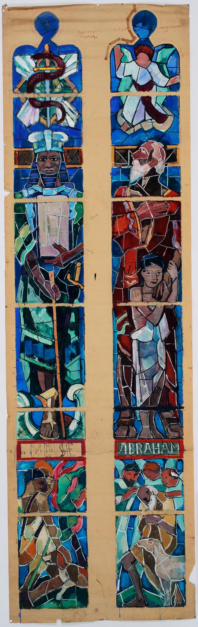 D’un point de vue du dessin aussi, des modifications importantes ont été apportées. Pour la lancette d’Abraham, l’épisode choisi pour le vitrail est différent de celui esquissé sur les dessins préparatoires où l’on voit Abraham, un couteau à la main, sur le point de sacrifier son fils Isaac. Pour la lancette consacrée à Moïse, les remaniements sont moins conséquents. Au centre, Moïse est déjà présenté de face. Il tient les Tables de la Loi de la main gauche et plus de la droite. Il tient de l’autre main un bâton et plus une épée. Alors qu’il est coiffé d’un chapeau sur le projet définitif, sur les dessins, il dévoile ses cornes sur une tête nue. Sur la scène supérieure, peu de transformations. Le serpent est déjà présent mais sans l’épée. Par contre, une modification de scène a été effectuée pour la partie inférieure. Alors qu’au début c’est l’épisode de Moïse séparant les eaux qui avait été choisi, il a été remplacé par la scène du buisson ardent.