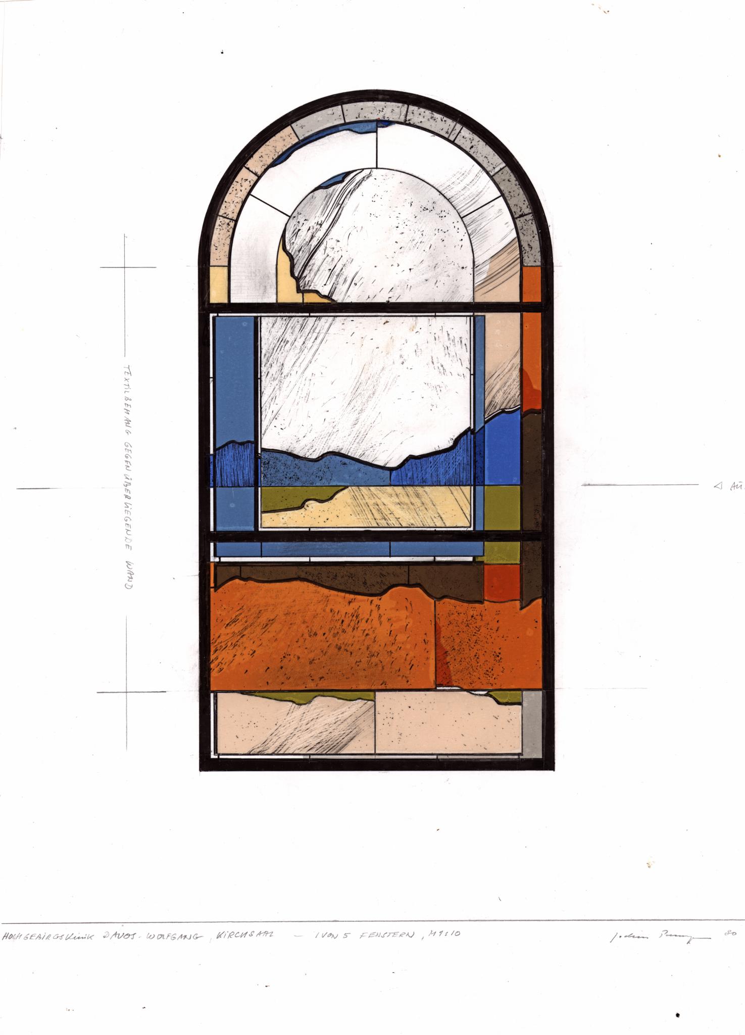 Der Entwurf ist Teil eines Gesamtkonzepts für die Umgestaltung des ehemaligen Speisesaals der Hochgebirgsklinik Davos-Wolfgang in einen evangelischen Kirchsaal. Fünf Rundbogenfenster gliedern eine der Längsseiten des schmalen Raumes. Dieser Entwurf entspricht dem vierten Fenster von links auf dem Vorentwurf (VMR_1520). Die Fenster wurden 1981 in der Glasmalerei Hein Derix in Kevelaer ausgeführt.