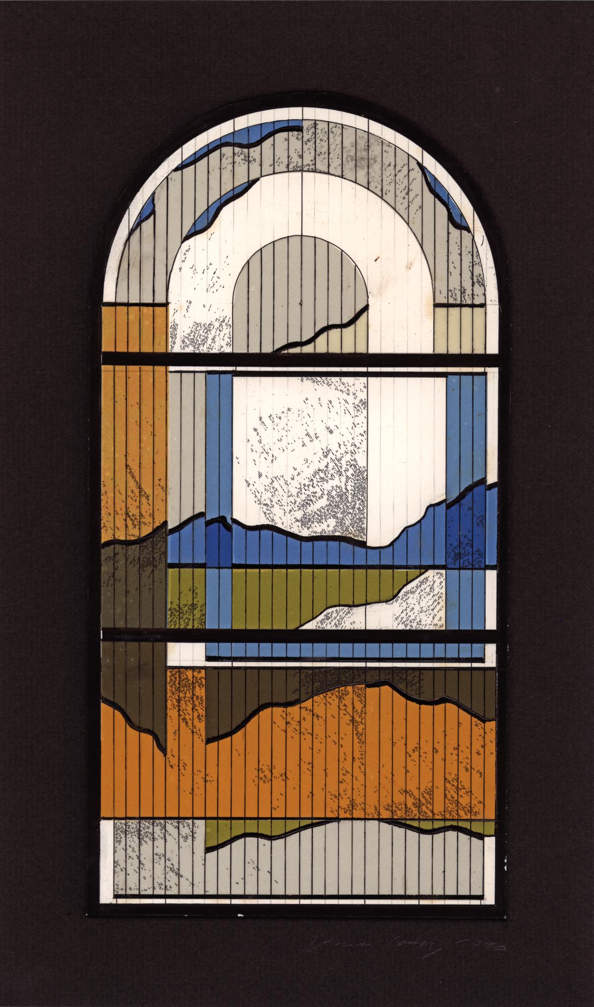 Entwurf für ein Rundbogenfenster. Die Darstellung in orange-braunen und blau-grünen Tönen evoziert eine Berglandschaft.